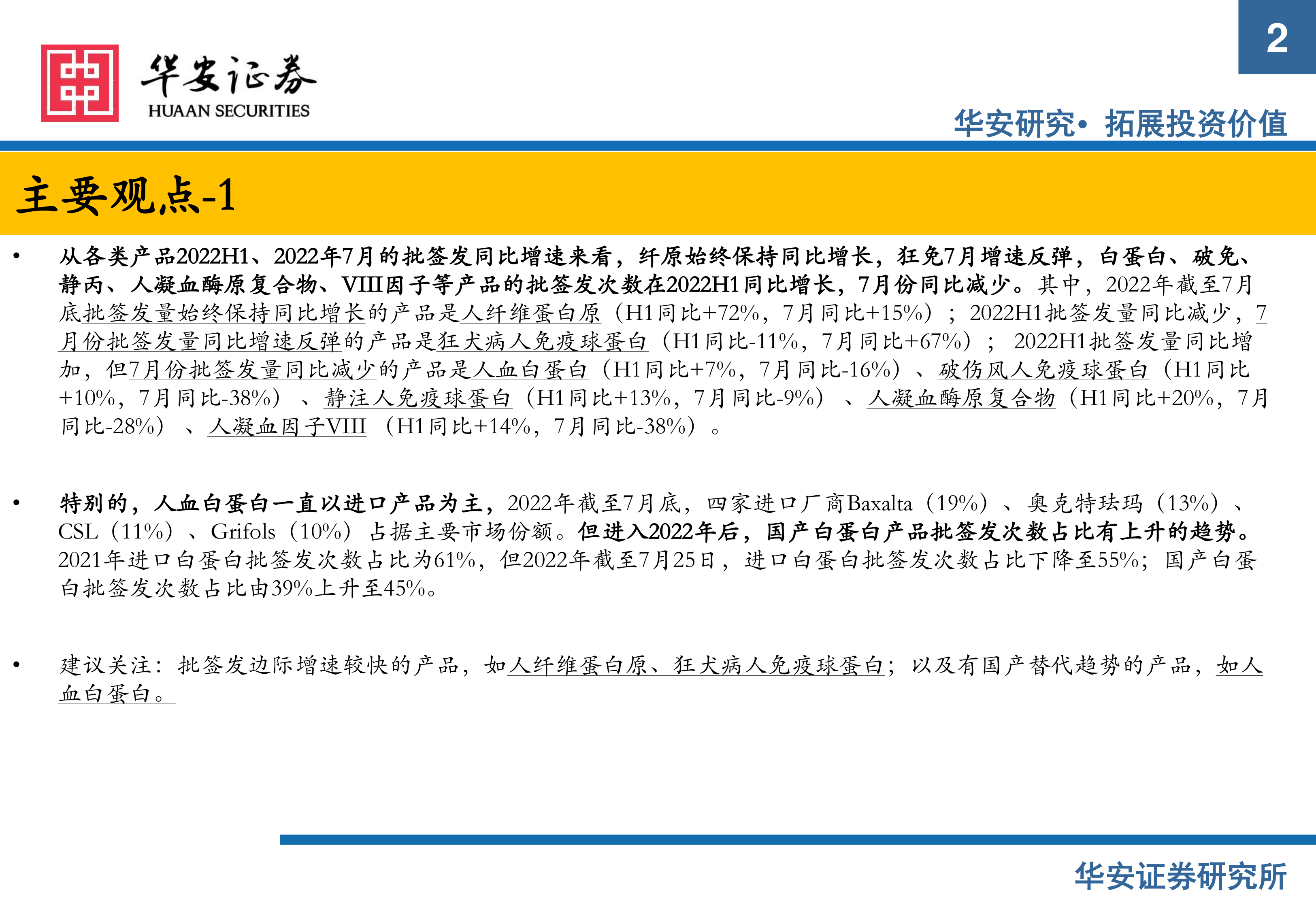 建议关注:批签发边际增速较快的产品,如人纤维蛋白原、狂犬病人免疫球蛋白;以及有国产替代趋势的产品,如人血白蛋白。