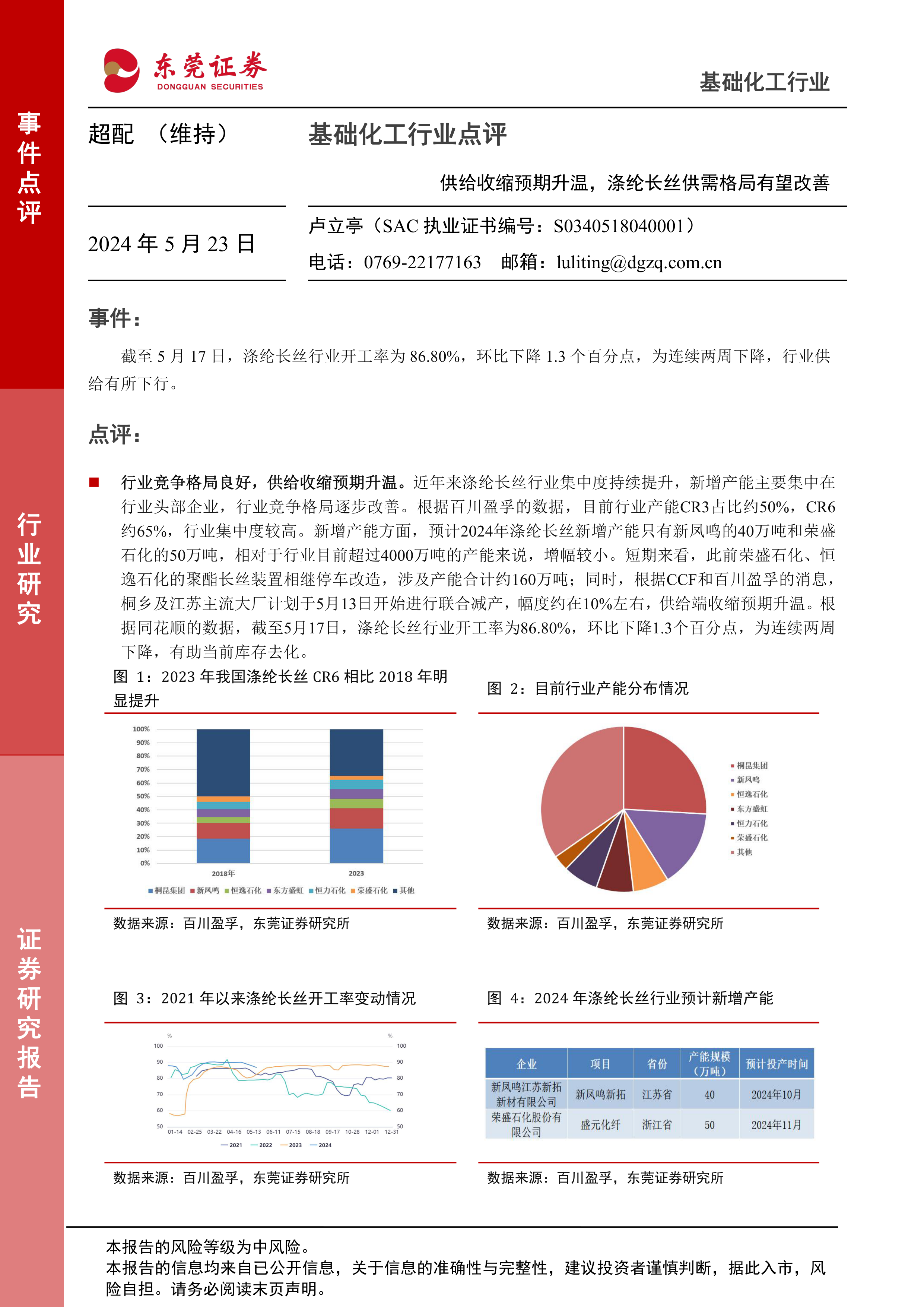 报告通过图表展示了2018年和2023年涤纶长丝行业产能分布情况,以及2021年以来涤纶长丝开工率变动情况和2024年涤纶长丝行业预计新增产能,直观地展现了行业集中度提升和供给收缩的趋势。