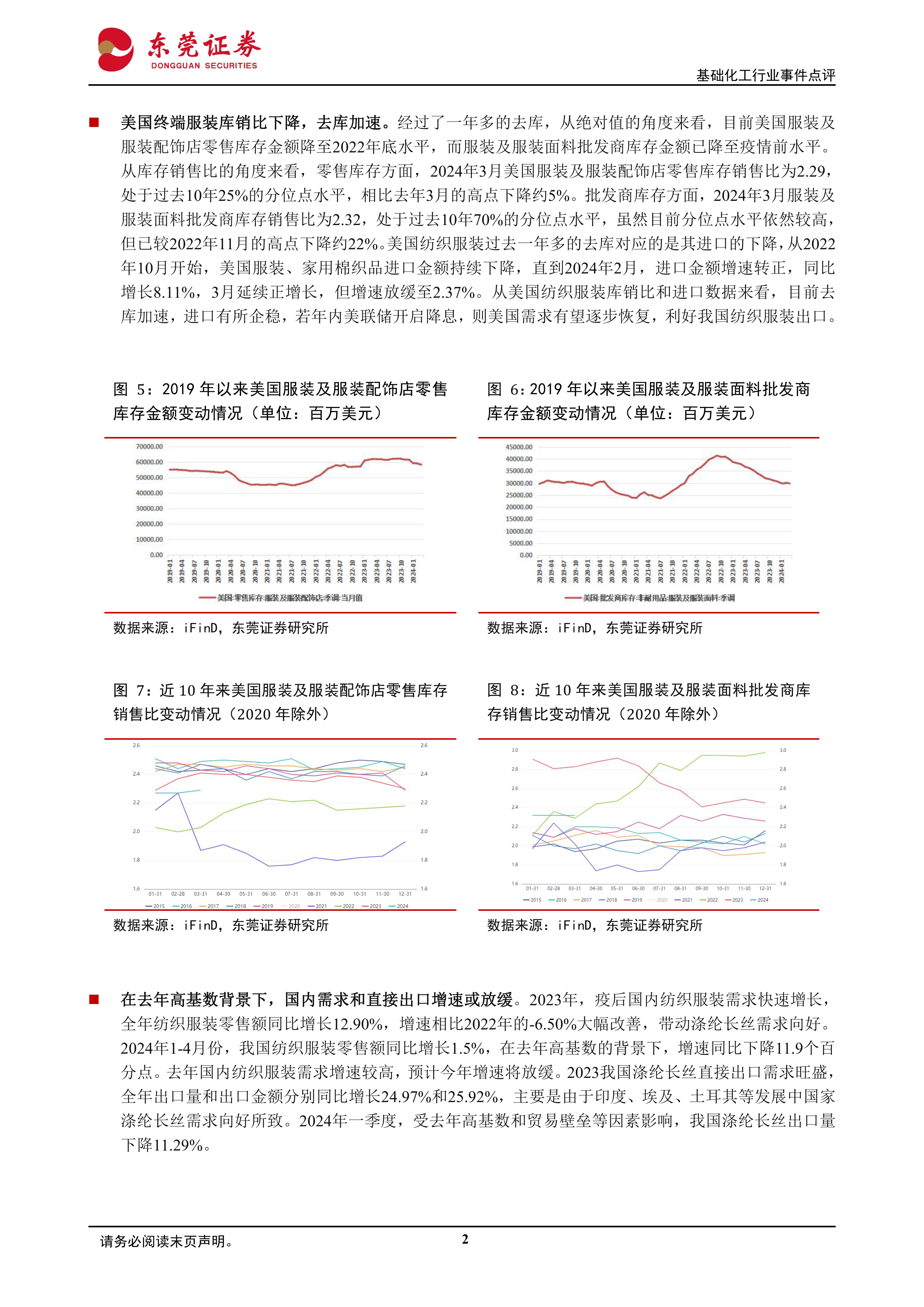 报告分析了国内外纺织服装市场需求情况。国内方面,2023年纺织服装零售额同比增长12.90%,但2024年1-4月份增速放缓至1.5%;国际方面,报告重点关注美国市场,指出美国终端服装去库加速,进口有所企稳,若美联储年内降息,则利好海外需求恢复。报告通过图表展示了2019年以来美国服装及服装配饰店零售库存金额、服装及服装面料批发商库存金额、库存销售比以及我国纺织服装零售额累计同比增速和我国涤纶长丝出口量变动情况,支持了其分析结论。