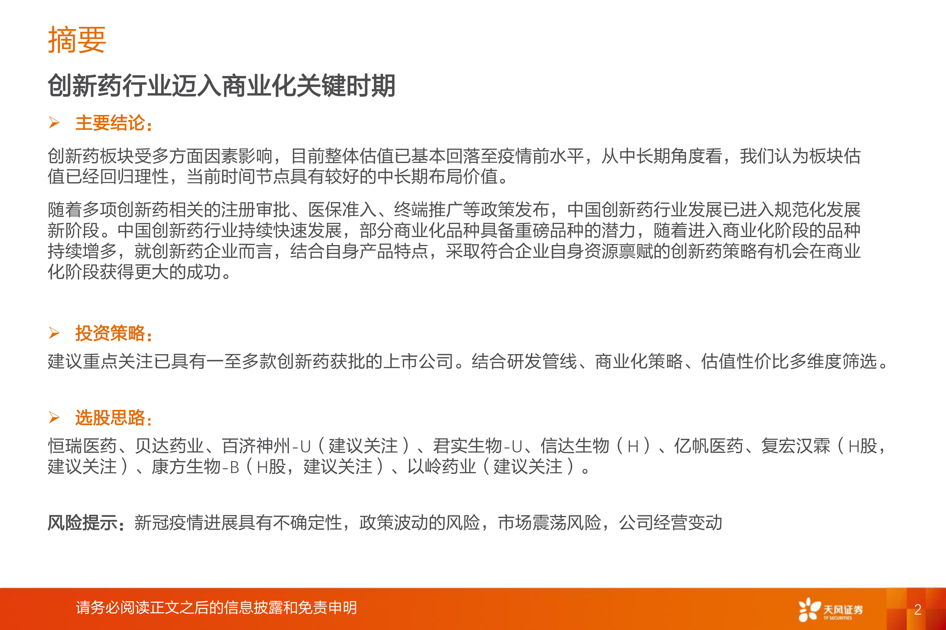 本报告对中国创新药行业进行了全面而深入的分析,指出行业已进入商业化关键时期,板块估值回归理性,具有较好的中长期布局价值。报告从估值、政策、行业概况、商业化进度等多个维度,结合大量数据和案例,分析了行业现状及未来发展趋势,并提出了相应的投资策略和选股思路,为投资者提供了重要的参考依据。 需要注意的是,创新药行业发展仍面临诸多挑战,例如新冠疫情的不确定性、政策波动风险、市场震荡风险以及公司经营变动等,投资者需谨慎决策。