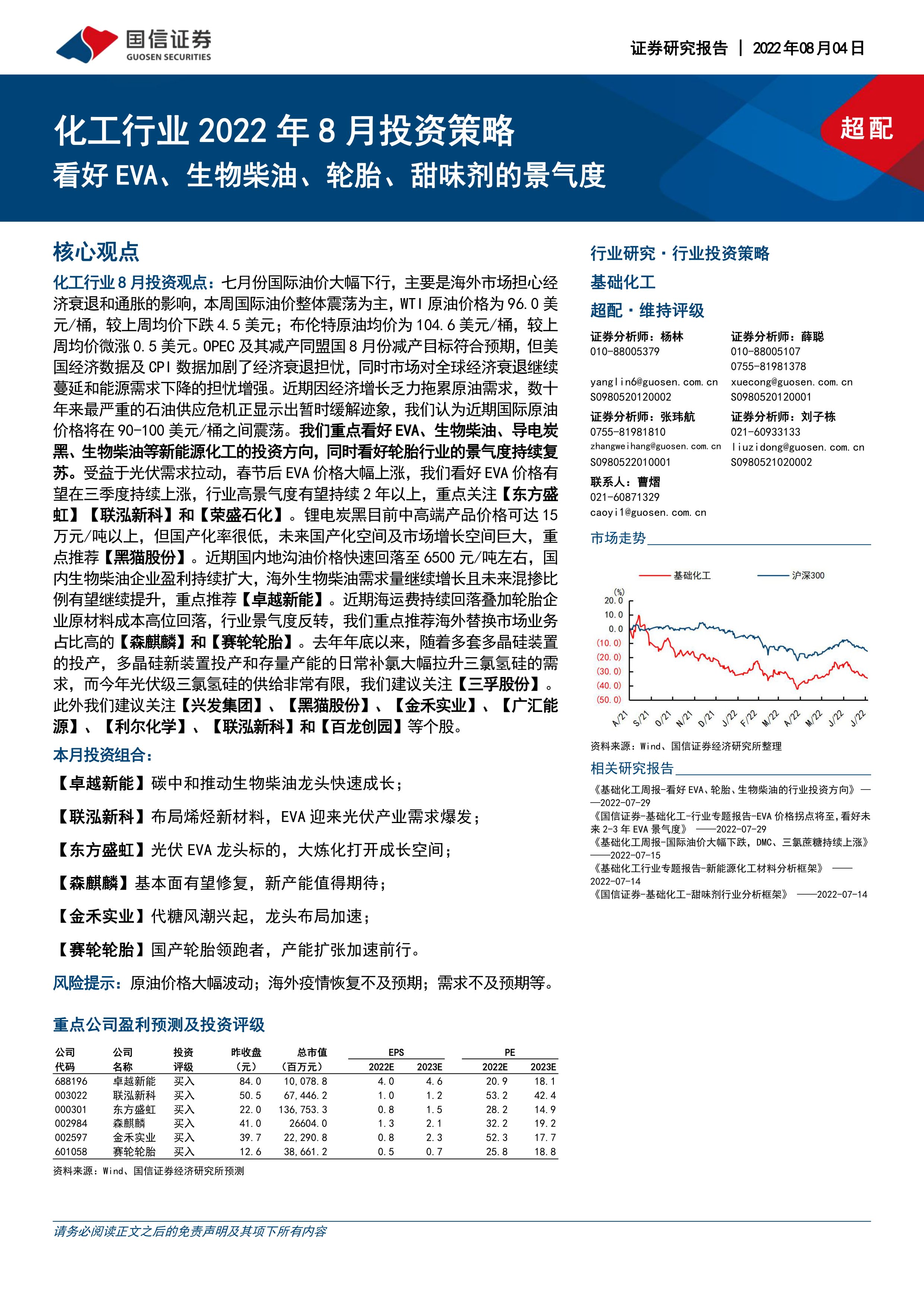 化工行业2022年8月投资策略:看好EVA、生物柴油、轮胎、甜味剂的景气度