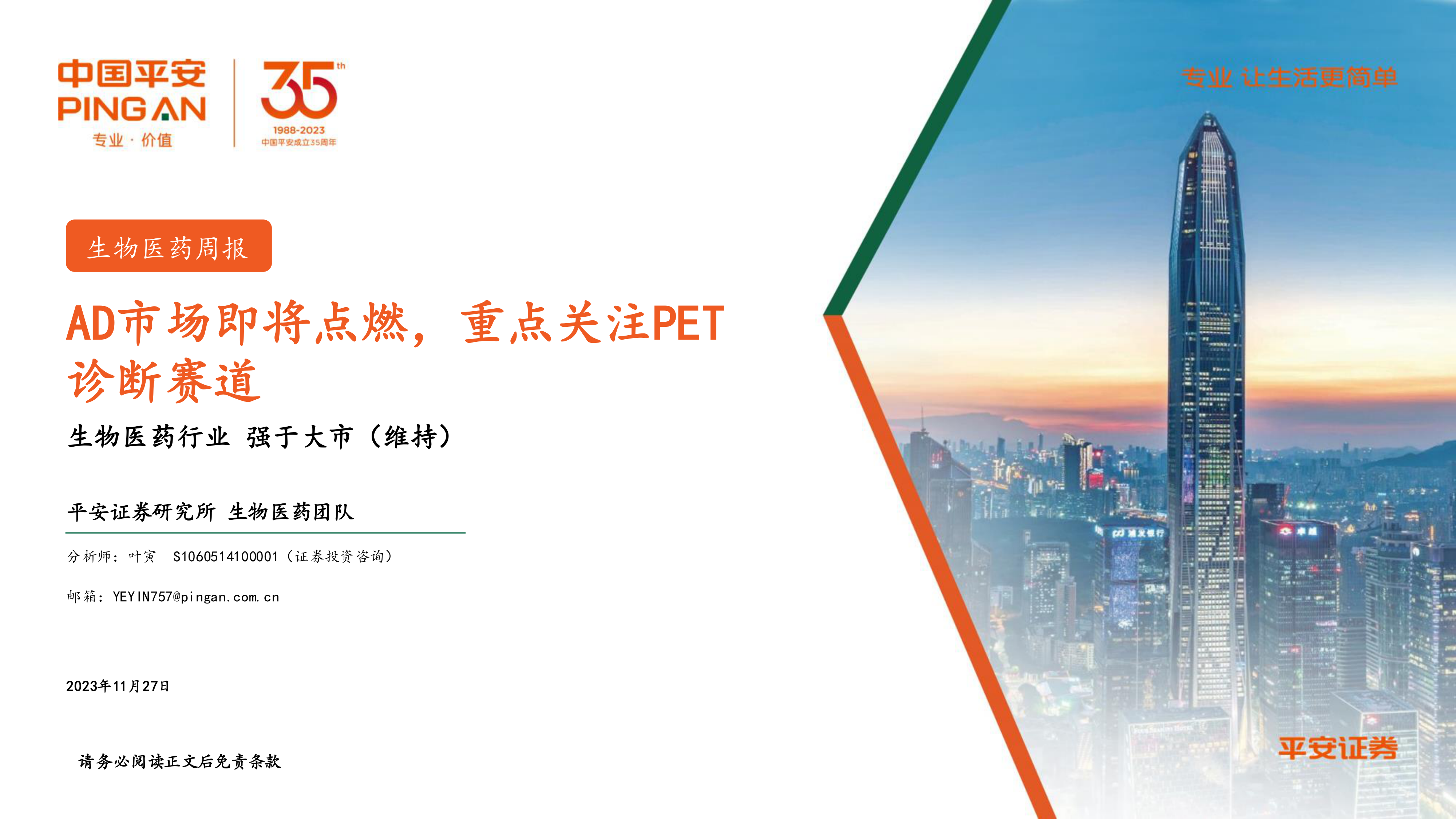 本报告基于阿尔兹海默症治疗药物的突破性进展,特别是Aβ靶向药物的上市,对AD诊断市场进行了深入分析,并重点关注了PET诊断赛道。报告建议投资者关注PET显影剂龙头企业、外周血检测领域企业以及Aβ创新药相关企业,并对多家医药企业进行了详细的投资分析,为投资者提供了有价值的参考信息。 然而,投资者需注意报告中提到的政策风险、研发风险和公司经营风险等因素,谨慎进行投资决策。 报告数据主要来源于Wind和平安证券研究所,投资者应独立验证数据准确性。