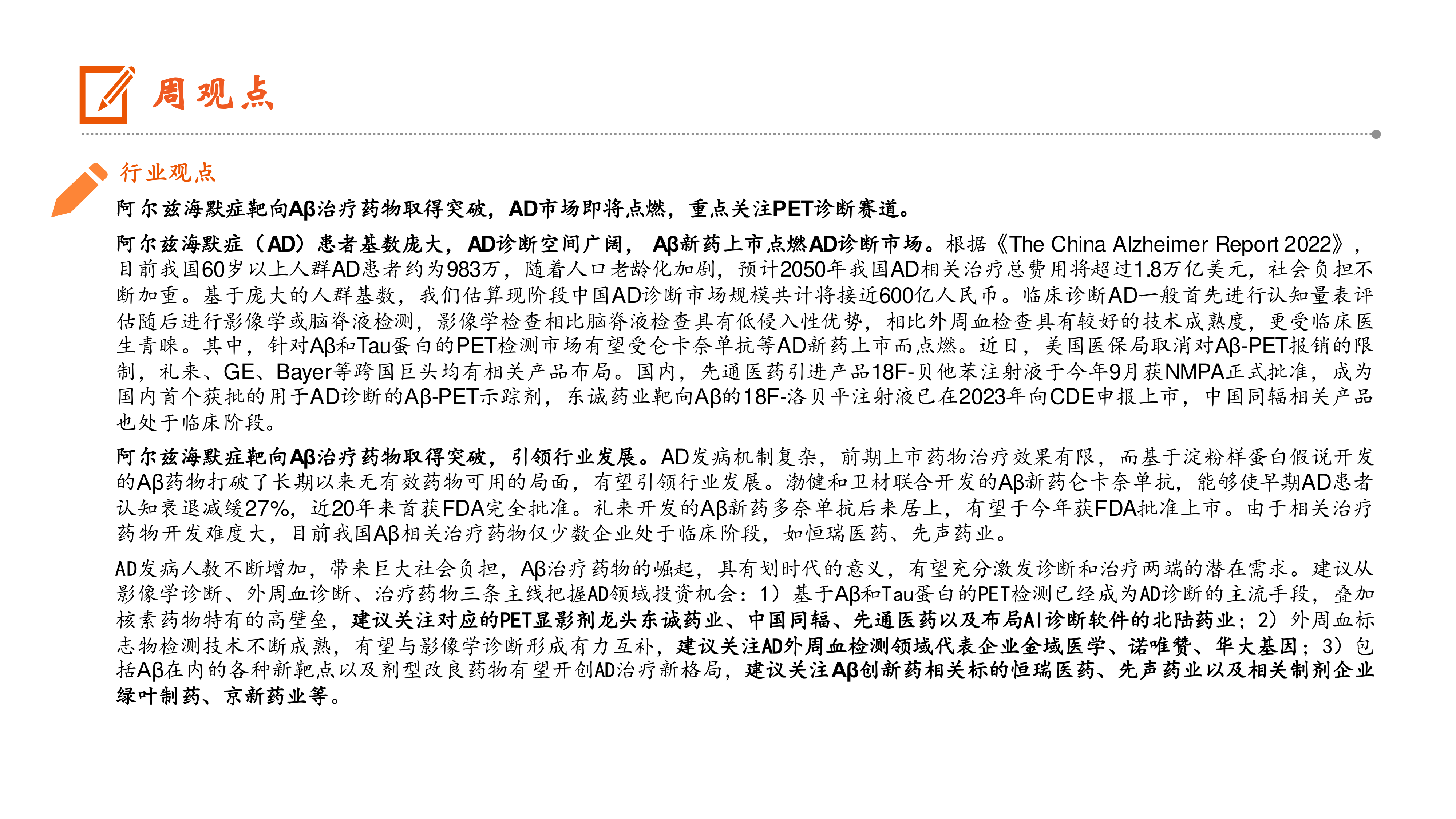 本报告的核心观点是:阿尔兹海默症(AD)治疗药物的突破性进展,特别是Aβ靶向药物的上市,将极大刺激AD诊断市场的增长,其中PET诊断赛道将成为重点关注领域。报告建议投资者关注PET显影剂龙头企业、外周血检测领域企业以及Aβ创新药相关企业。