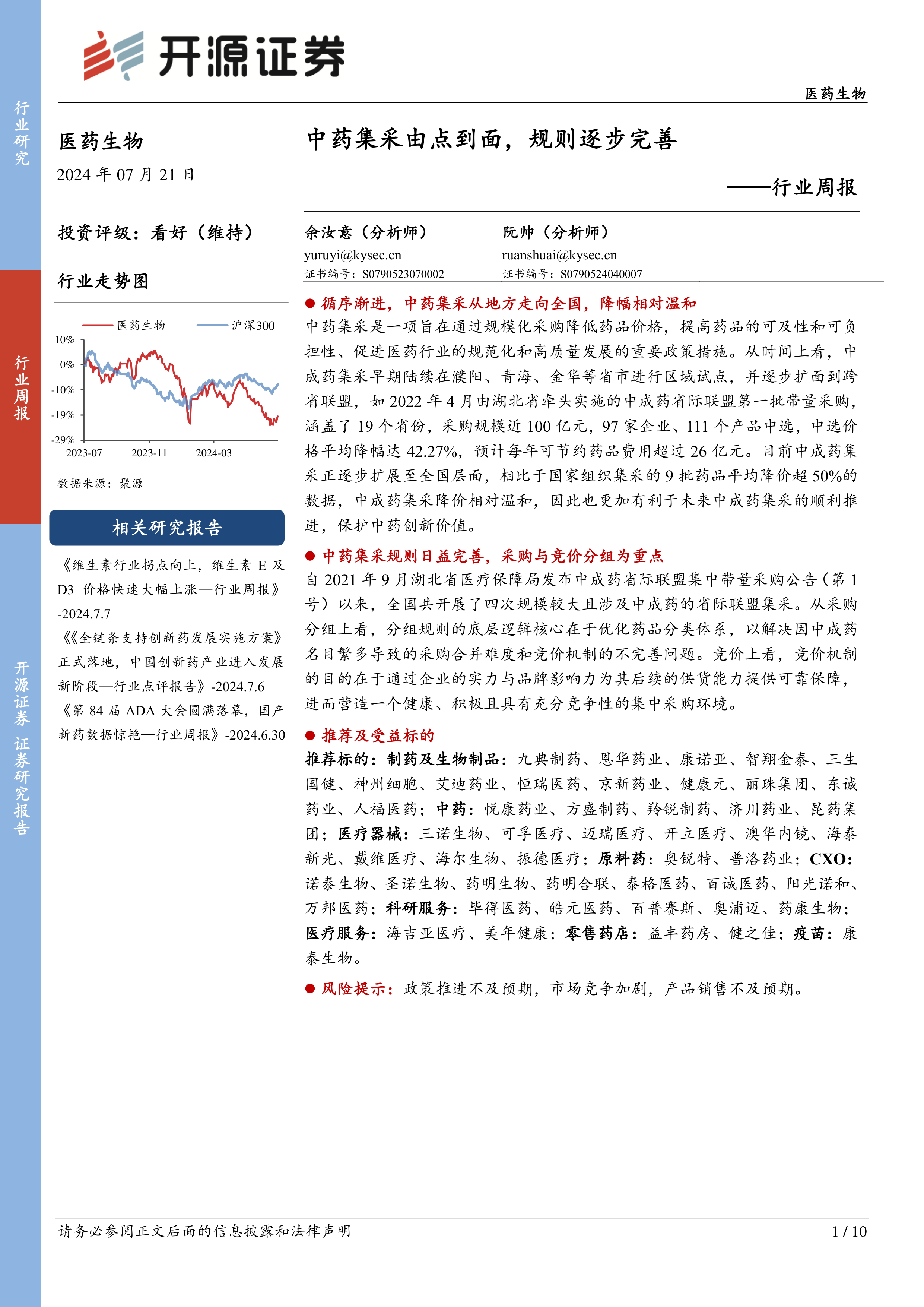 本报告对中药集采政策的演变、规则完善以及7月第3周医药生物板块行情进行了深入分析。中药集采政策的逐步推进和规则完善,为中药行业发展提供了新的机遇和挑战。相对温和的降价幅度有利于保护中药创新价值,但同时也需要进一步完善集采规则,建立更科学的多维评价体系。7月第3周医药生物板块行情显示,不同子板块表现分化,投资者需关注市场变化和政策风险。 报告最后列出了推荐的医药生物相关标的,但需注意报告中提到的风险提示,投资决策应基于自身情况和专业建议。