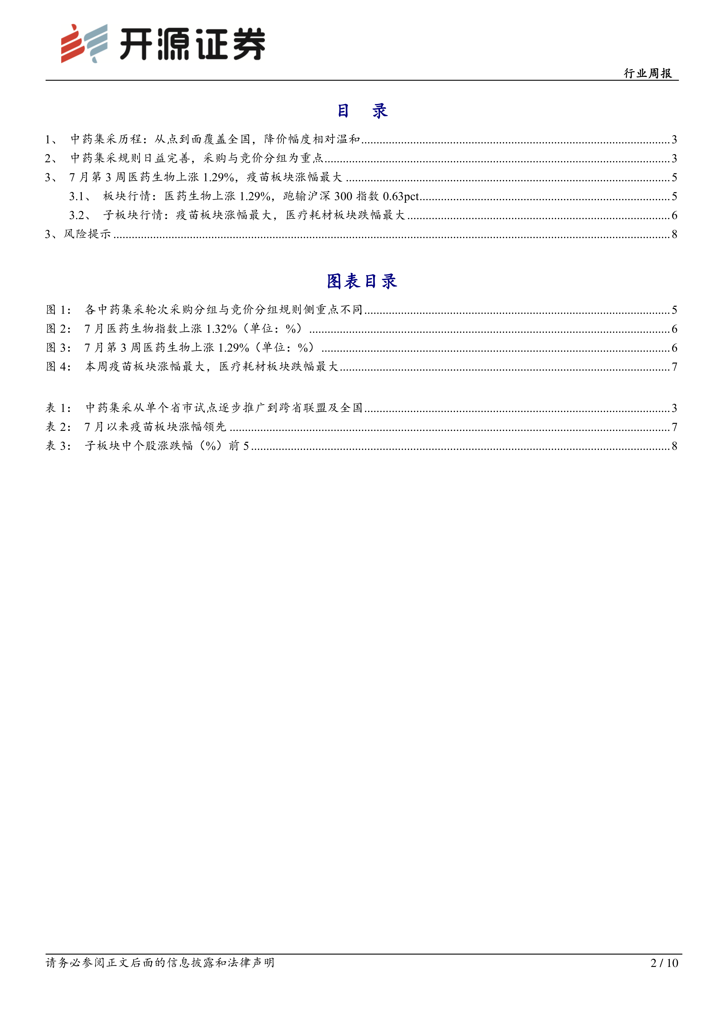 本报告的核心观点是:中药集采政策正逐步完善,从地方试点走向全国,但降价幅度相对温和,有利于中药创新价值的保护和行业可持续发展。报告同时分析了7月第3周医药生物板块的市场行情,疫苗板块涨幅最大,医疗耗材板块跌幅最大。