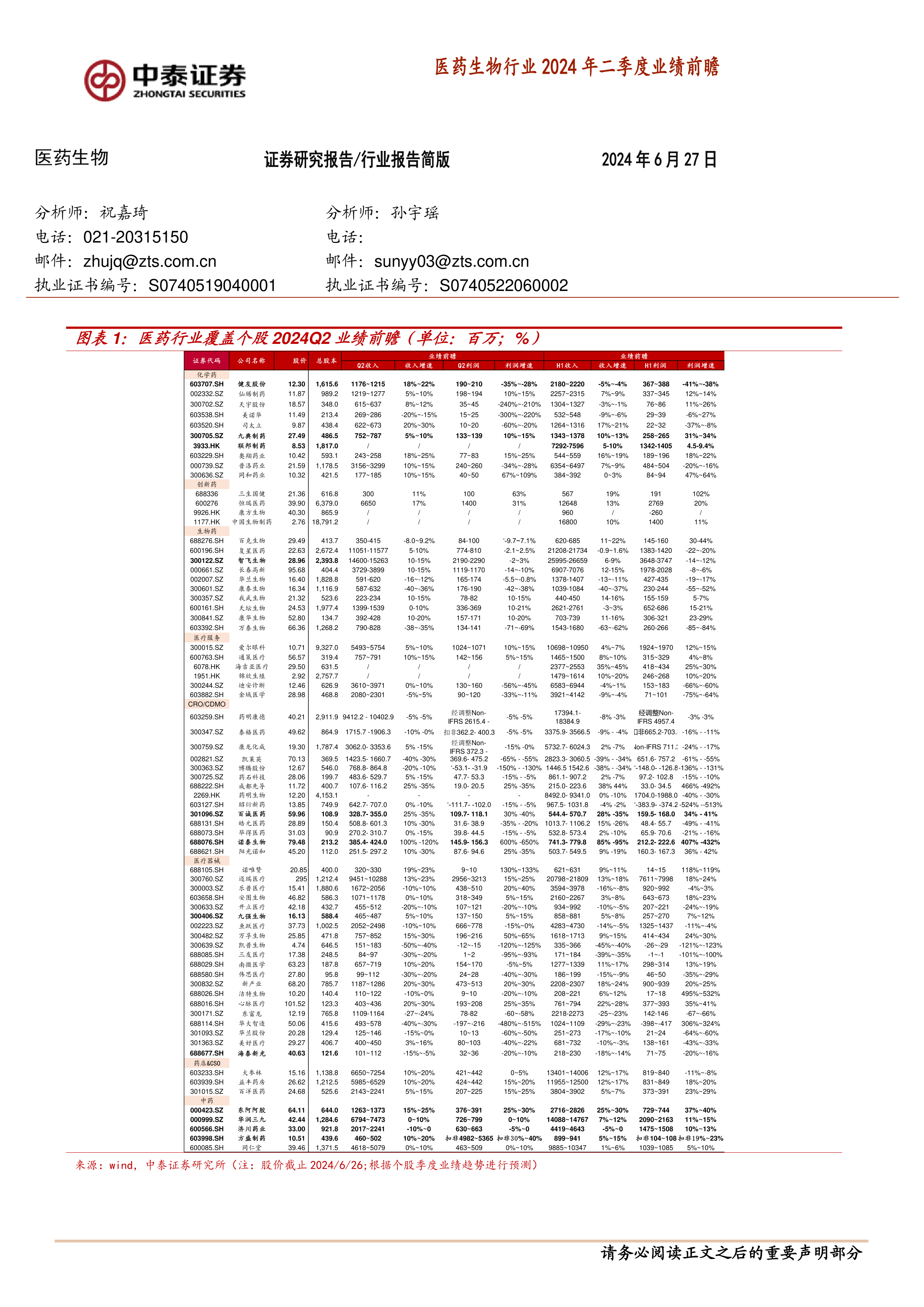 本报告以表格形式呈现了医药生物行业覆盖个股2024年二季度业绩前瞻,涵盖化学药、创新药、生物药、医疗服务、CRO/CDMO、医疗器械以及药店&CSO等多个细分领域。报告对每个细分领域内部分公司的Q2收入、收入增速、Q2利润、利润增速、H1收入、收入增速、H1利润以及利润增速进行了预测。