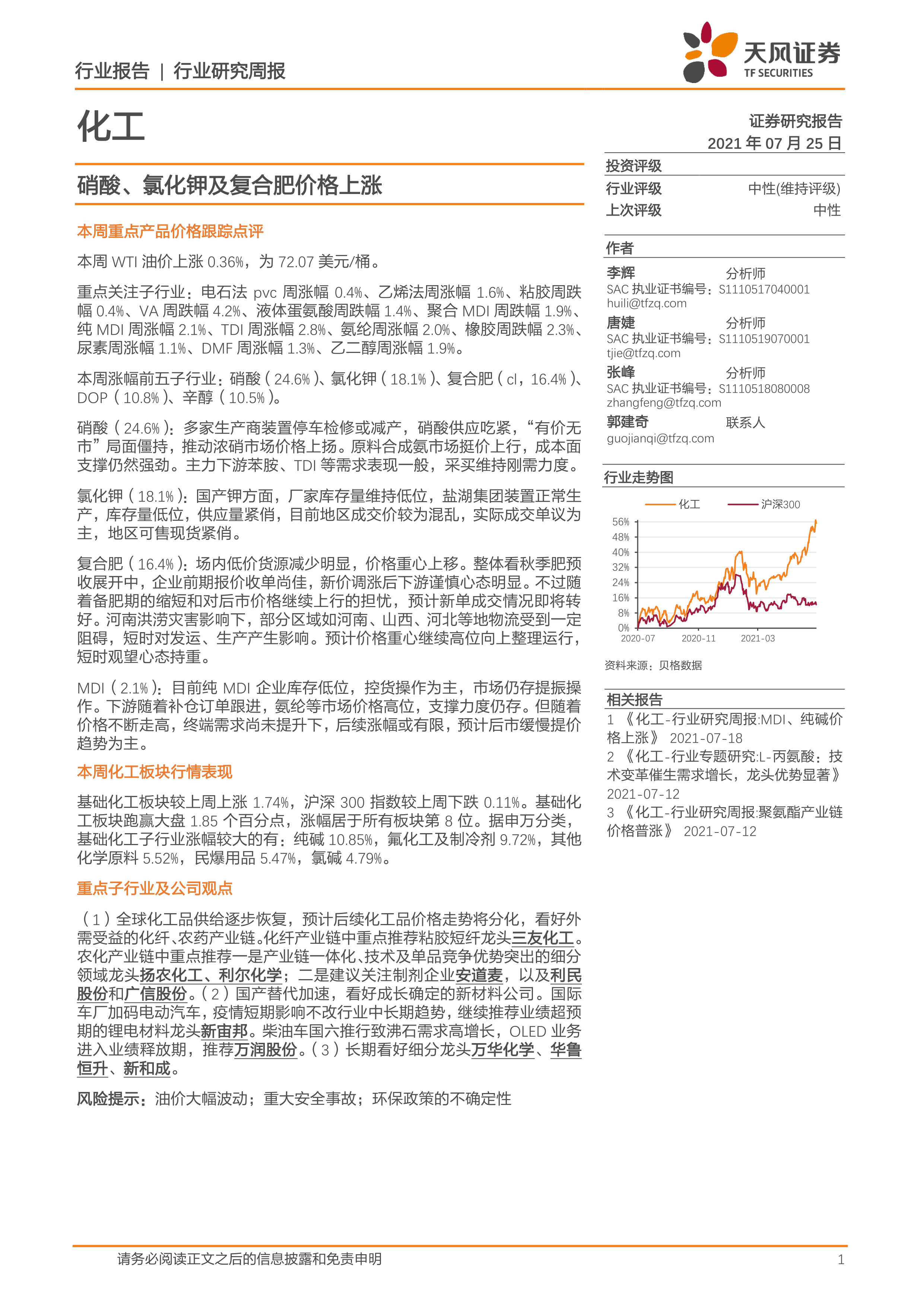化工行业研究周报:硝酸、氯化钾及复合肥价格上涨