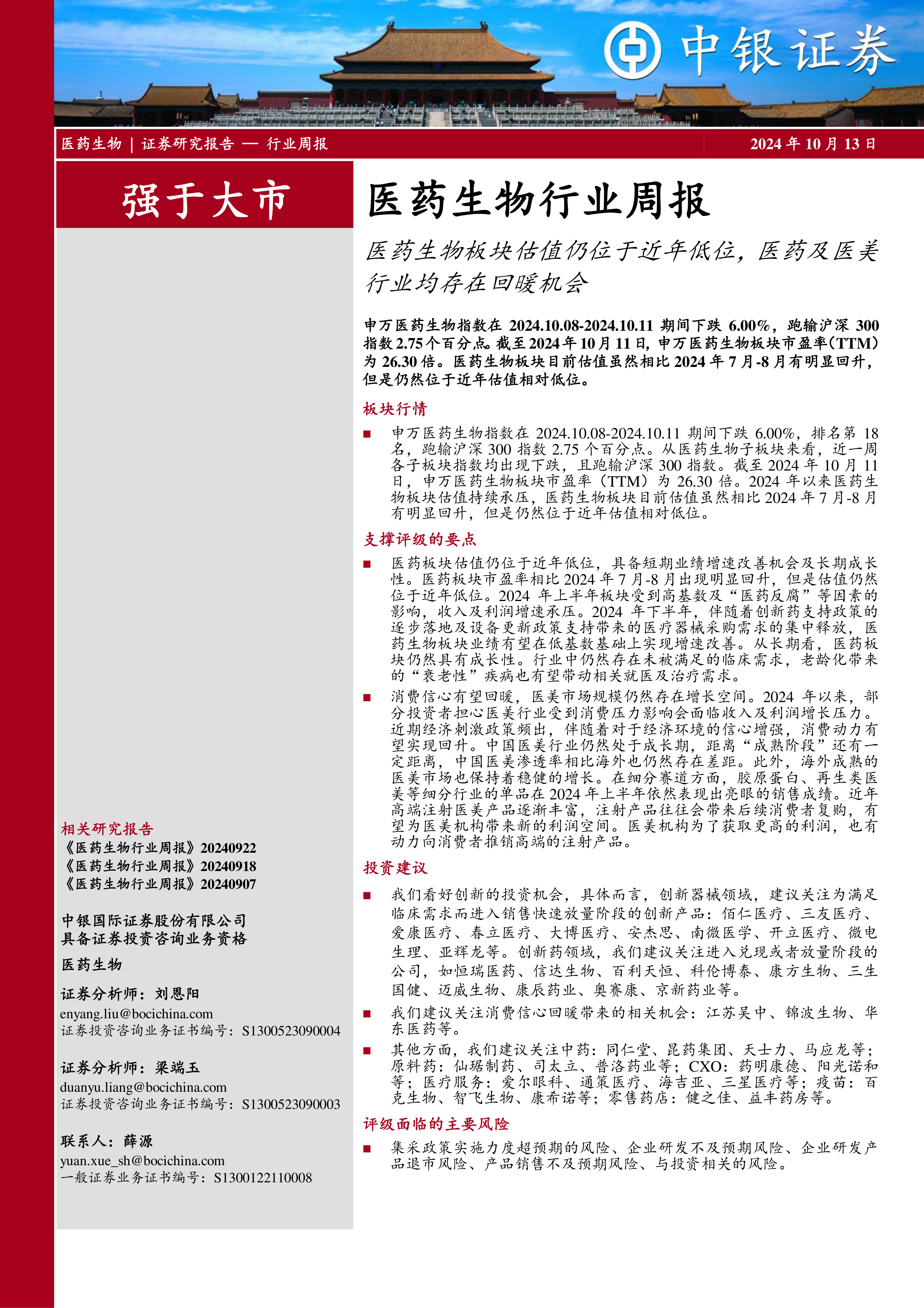 本报告分析了2024年10月8日至11日期间申万医药生物板块的行情,指出板块估值处于近年低位,并分析了其短期业绩增速改善和长期成长潜力。报告认为,消费信心回暖将利好医美市场。基于此,报告提出了具体的投资建议,并提示了潜在的投资风险,为投资者提供了医药生物行业投资策略的参考。 报告数据显示,虽然短期内板块表现受市场整体波动影响,但长期来看,医药生物行业仍具有显著的增长潜力,值得持续关注。