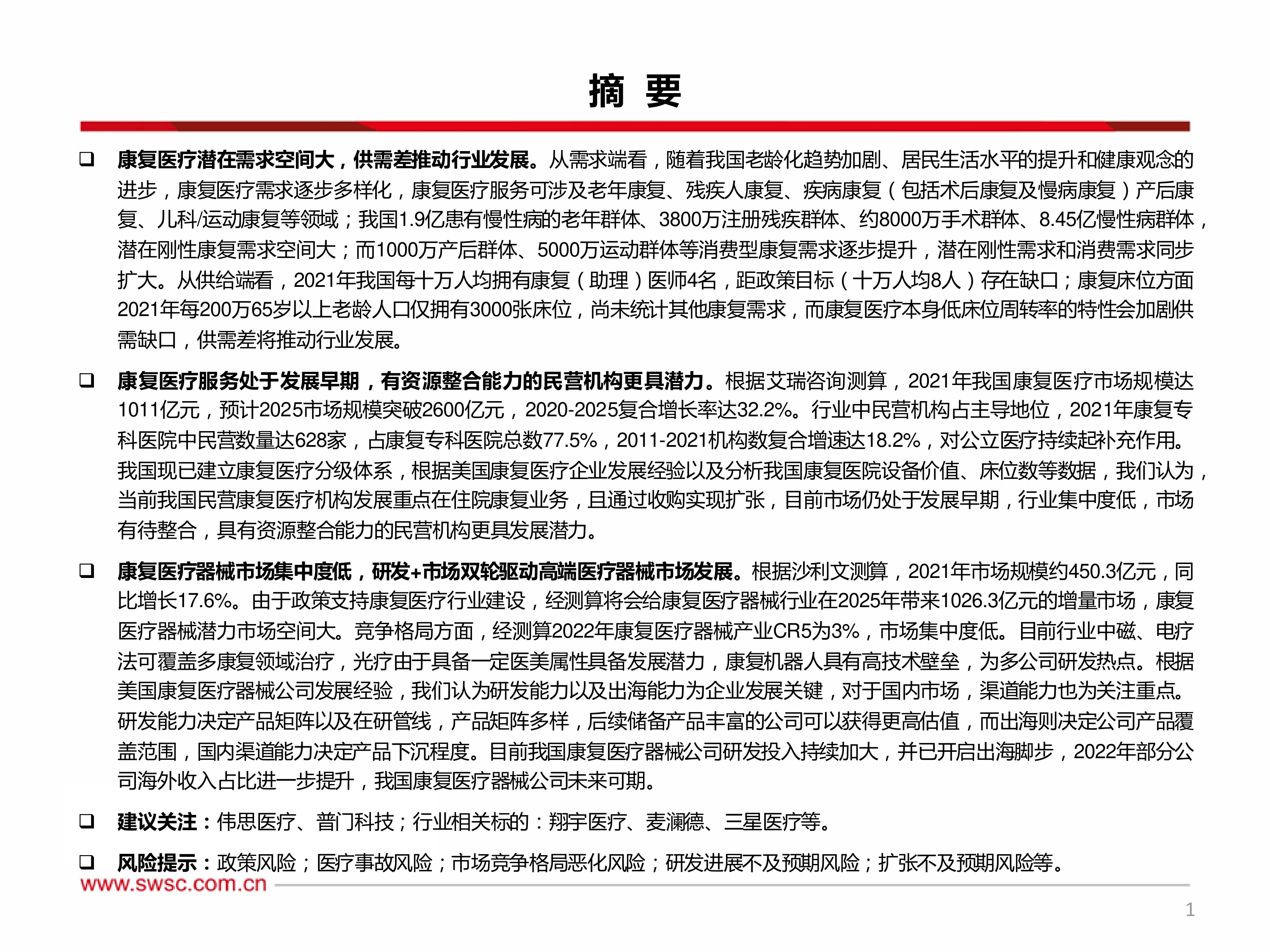 本报告的核心观点是:中国康复医疗行业正处于蓬勃发展阶段,巨大的潜在需求和供给侧的不足共同推动行业快速增长。民营机构在康复医疗服务领域占据主导地位,并通过收购兼并等方式快速扩张。康复医疗器械市场规模巨大,但集中度低,研发能力和市场拓展能力将成为企业竞争的关键。