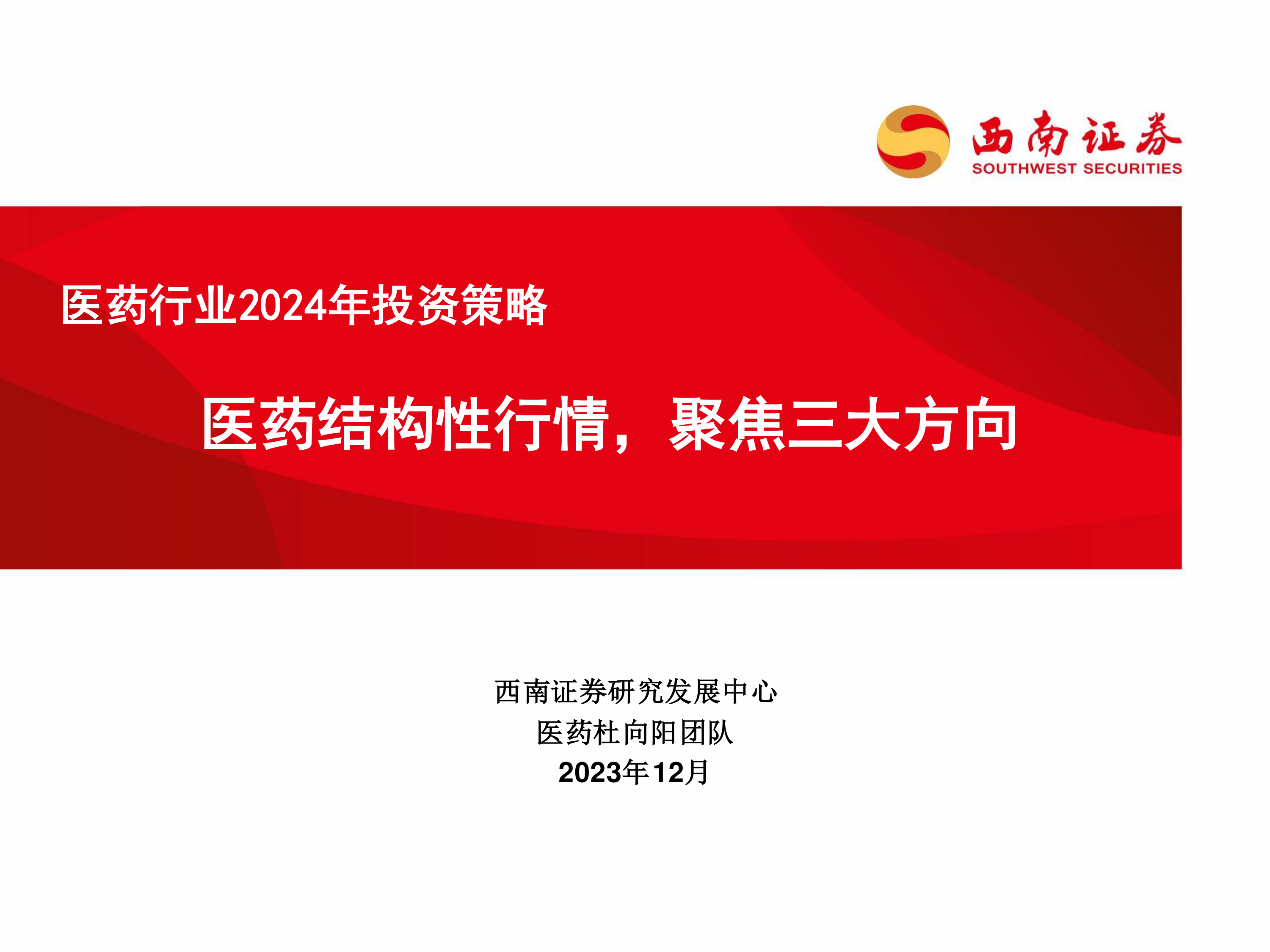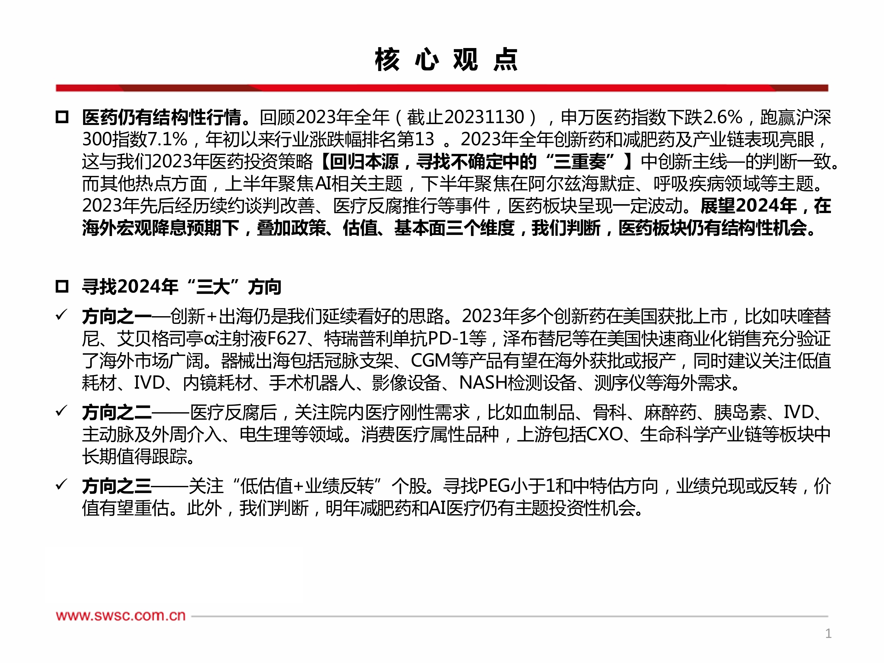 本报告的核心观点是:2024年医药行业仍存在结构性行情,投资机会主要集中在三大方向:创新+出海、医疗反腐后的院内刚需领域以及低估值+业绩反转个股。报告基于2023年医药行业政策和市场表现的回顾性分析,并结合宏观经济预期,对2024年的医药投资策略进行了详细阐述,并推荐了相应的投资组合。