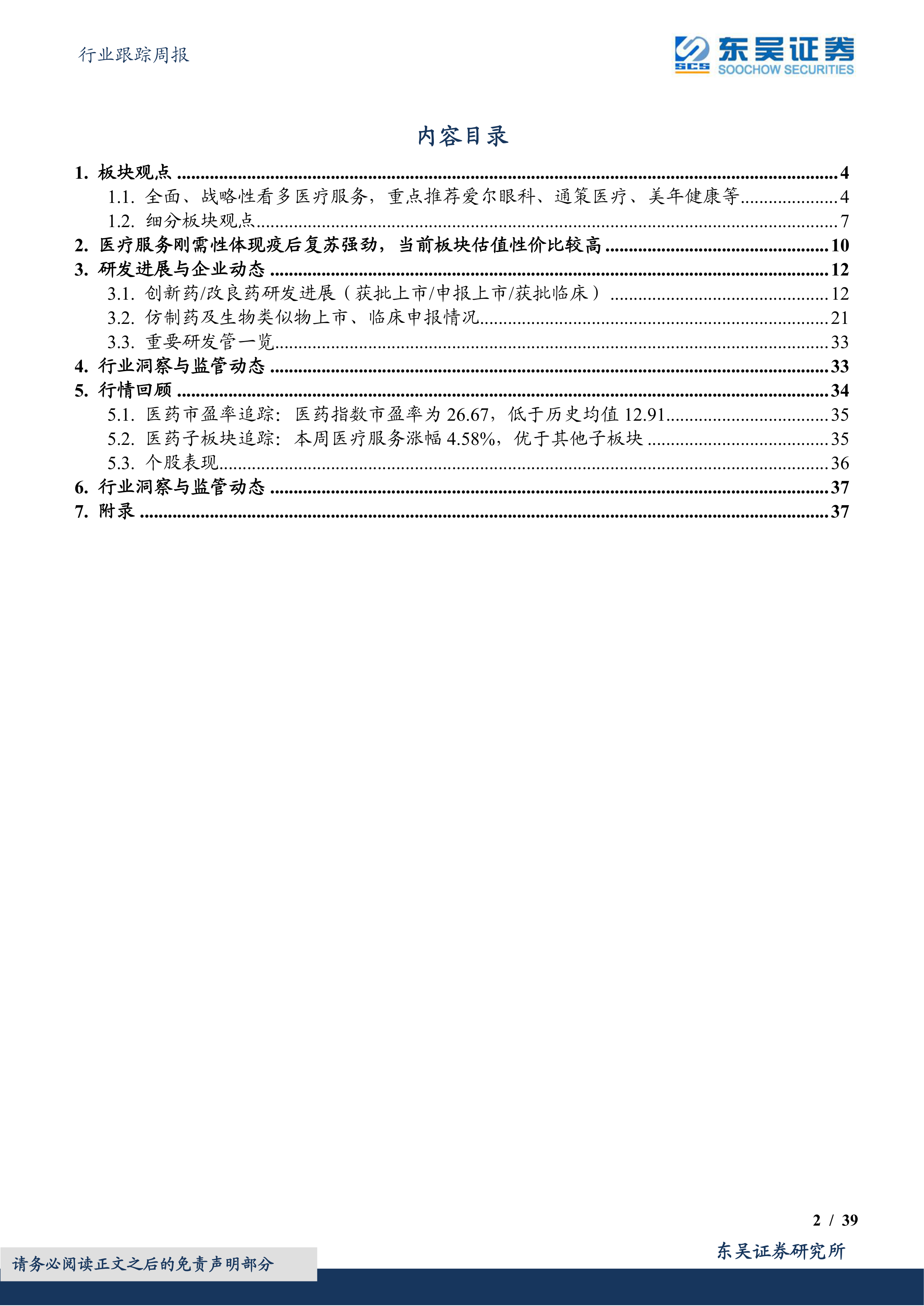 报告首先分析了医药生物行业整体走势,指出本周医药指数涨幅为+0.90%,年初至今跌幅为-6.68%,医疗服务板块涨幅最大。报告明确表达了全面、战略性看多医疗服务板块的观点,并重点推荐爱尔眼科、通策医疗、美年健康等个股,同时建议关注其他相关公司,如华厦眼科、美年健康、通策医疗、固生堂等。 报告还对中药、血制品、创新药、仿制药、耗材、消费医疗、科研服务等细分板块进行了观点阐述,并提供了具体的投资策略和建议关注的个股组合(见表1)。