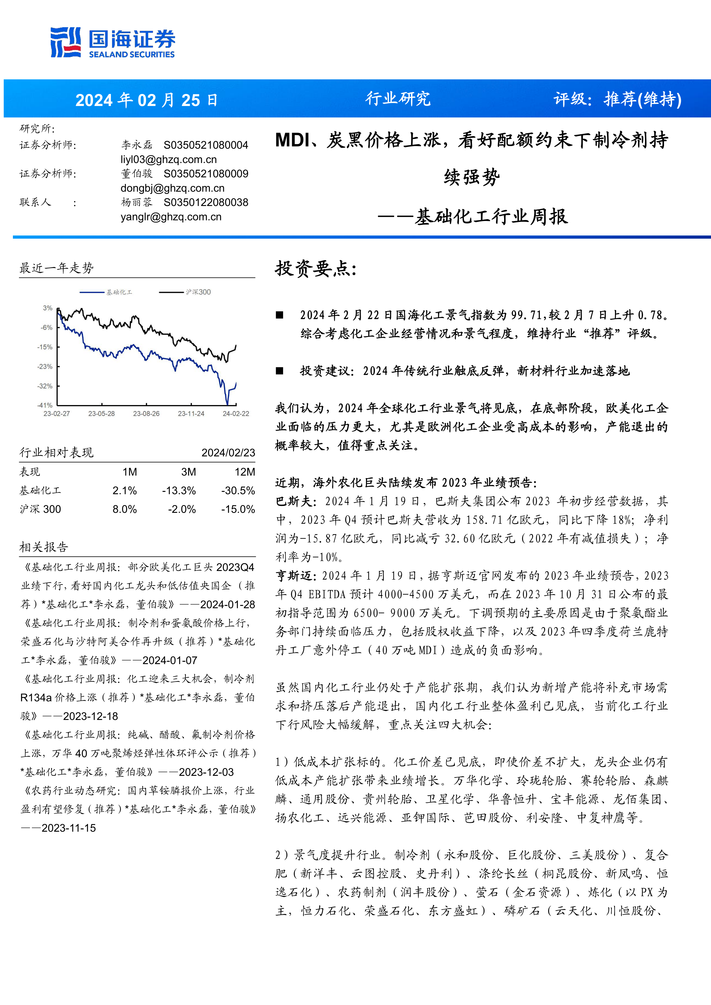 报告首先概述了基础化工行业最近一年的走势,并引用国海化工景气指数数据佐证行业景气度回升的判断。同时,对比了基础化工行业与沪深300指数的近期和年初至今的表现,分析了行业相对表现。