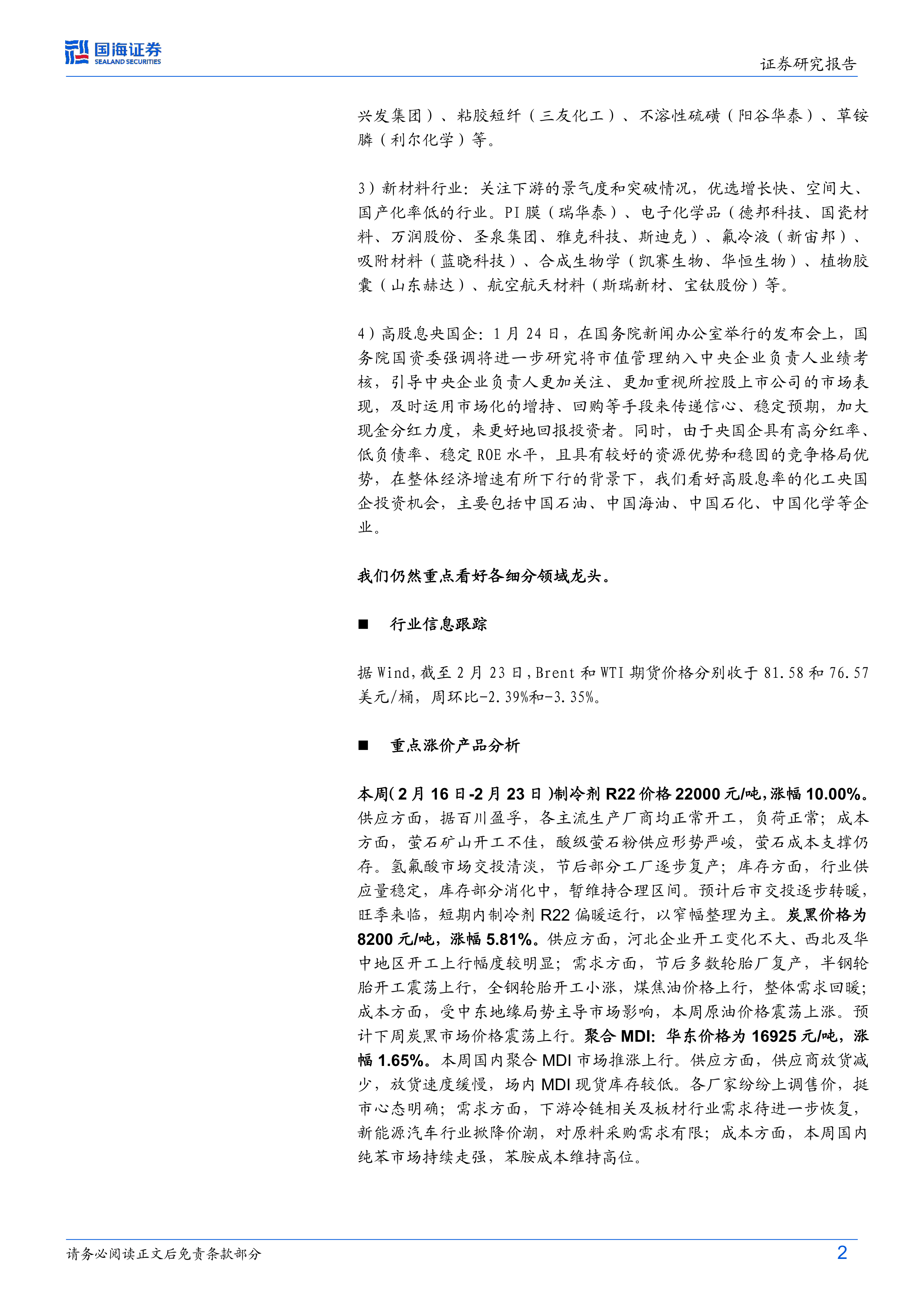 4)高股息央国企:1月24日,在国务院新闻办公室举行的发布会上,国务院国资委强调将进一步研究将市值管理纳入中央企业负责人业绩考核,引导中央企业负责人更加关注、更加重视所控股上市公司的市场表现,及时运用市场化的增持、回购等手段来传递信心、稳定预期,加大现金分红力度,来更好地回报投资者。同时,由于央国企具有高分红率、低负债率、稳定ROE水平,且具有较好的资源优势和稳固的竞争格局优势,在整体经济增速有所下行的背景下,我们看好高股息率的化工央国企投资机会,主要包括中国石油、中国海油、中国石化、中国化学等企业。