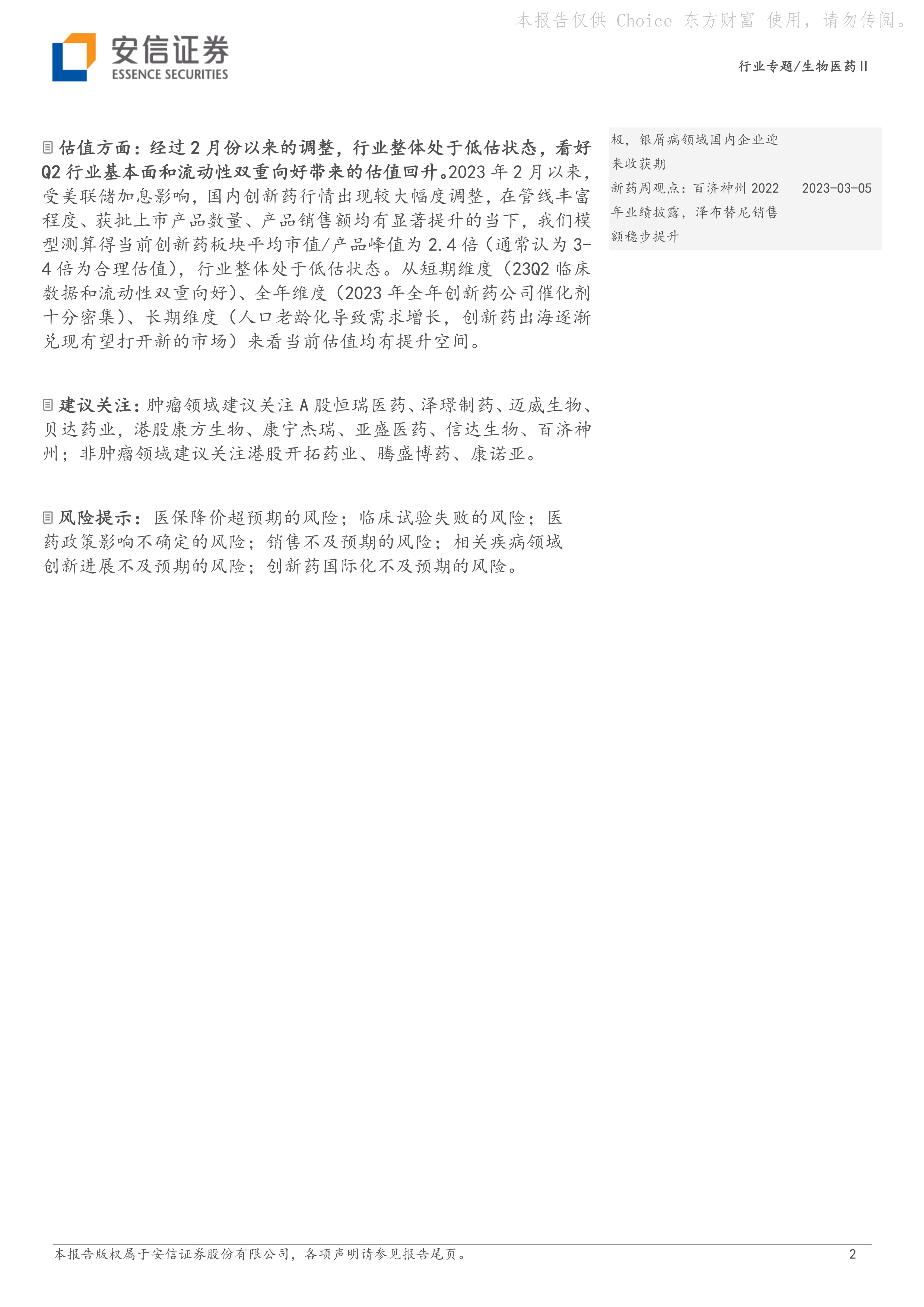 建议关注:肿瘤领域建议关注A股恒瑞医药、泽璟制药、迈威生物、贝达药业,港股康方生物、康宁杰瑞、亚盛医药、信达生物、百济神州;非肿瘤领域建议关注港股开拓药业、腾盛博药、康诺亚。