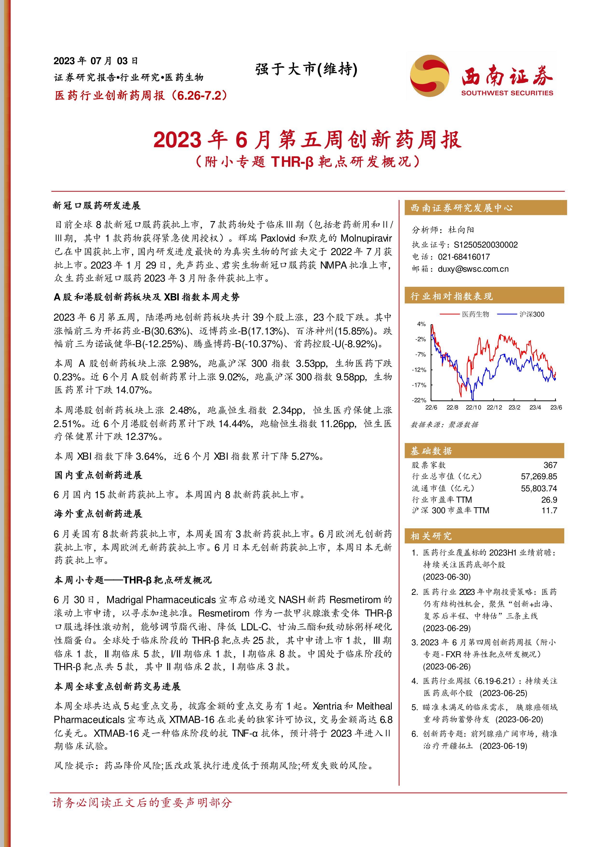 本报告的核心观点是:2023年6月第五周,中国及全球创新药市场呈现出积极与消极因素并存的态势。国内创新药板块表现强劲,跑赢大盘指数;而港股及美股创新药板块则表现相对疲软。 新冠口服药市场方面,国内外均有新药获批上市,但市场竞争日益激烈。此外,报告还特别关注了THR-β靶点药物的研发进展,并对近期重要的创新药交易进行了分析。