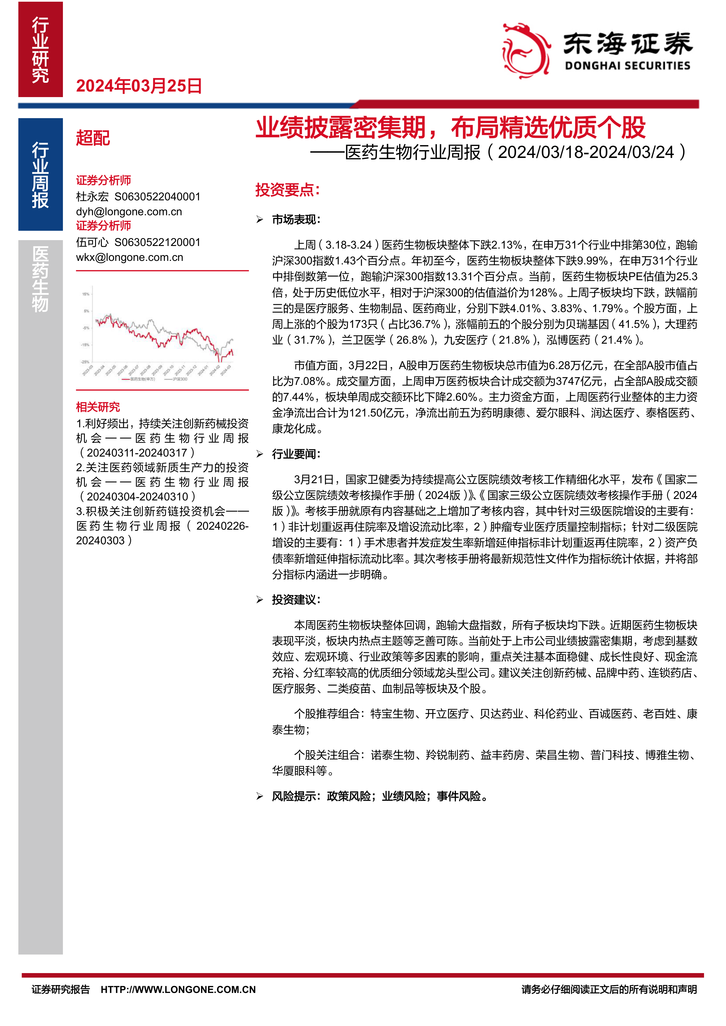 本报告对2024年3月18日至24日医药生物行业进行了全面分析。数据显示,板块整体表现低迷,跑输大盘,但估值已处于历史低位。在业绩披露密集期,投资者应谨慎选择,关注基本面稳健、成长性良好、现金流充裕、分红率较高的优质细分领域龙头公司。 报告中提到的政策变化和市场动态,为投资者提供了重要的参考信息,有助于做出更明智的投资决策。 然而,投资者仍需注意政策风险、业绩风险和事件风险。