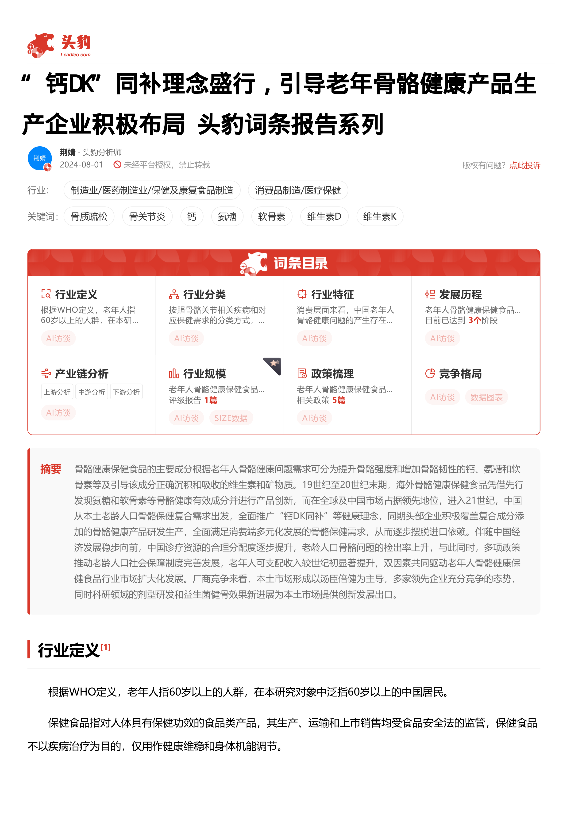 “钙DK”同补理念盛行,引导老年骨骼健康产品生产企业积极布局 头豹词条报告系列
