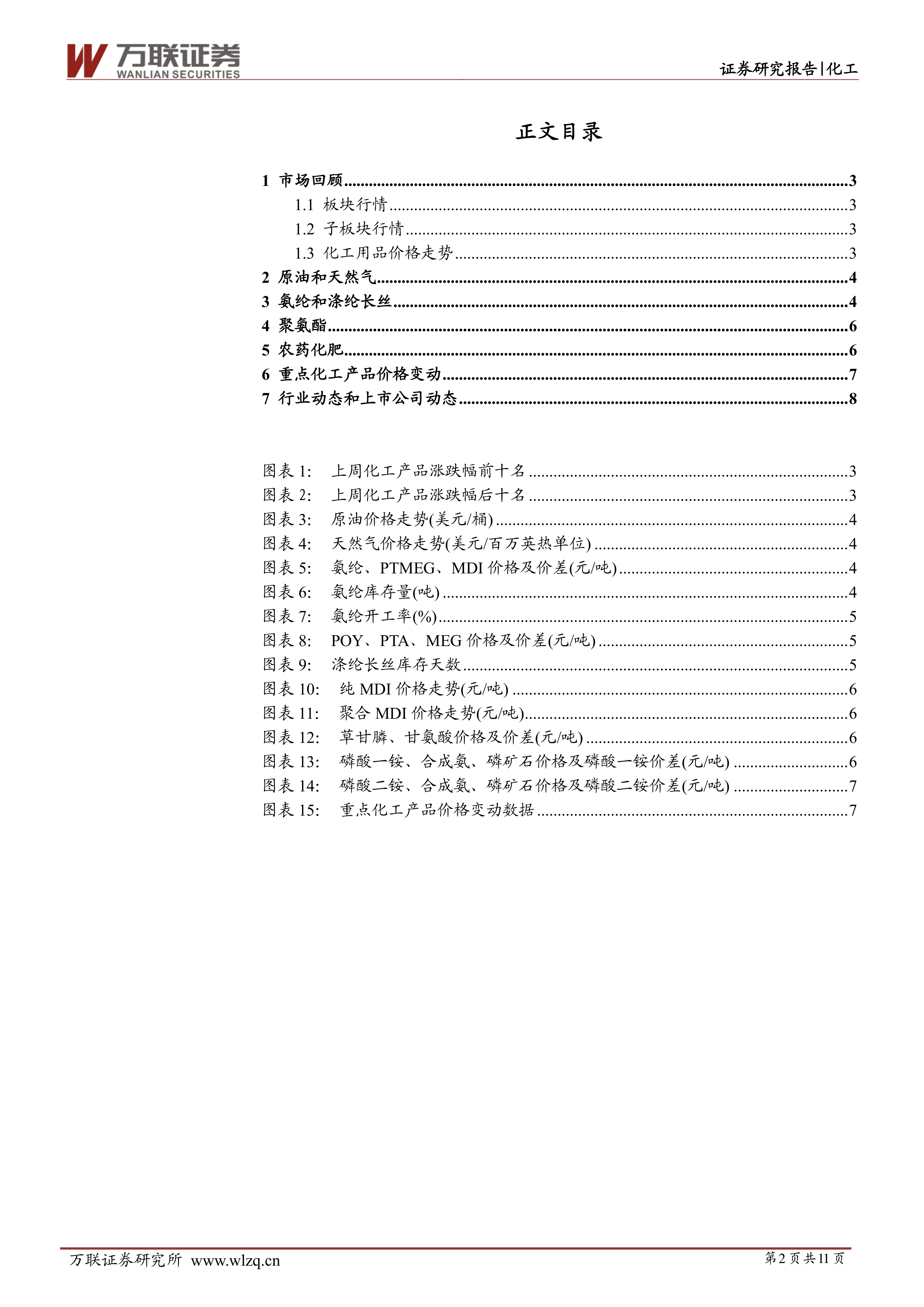 报告分别对原油、天然气、氨纶、涤纶长丝、聚氨酯、农药化肥等细分市场进行了深入分析,并提供了相应的图表数据,例如氨纶库存量、开工率、价格及价差;涤纶长丝库存天数、价格及价差;纯MDI、聚合MDI价格走势;草甘膦、甘氨酸价格及价差;磷酸一铵、磷酸二铵、合成氨、磷矿石价格及价差等。 分析涵盖了供需关系、价格波动原因以及未来走势预测。
