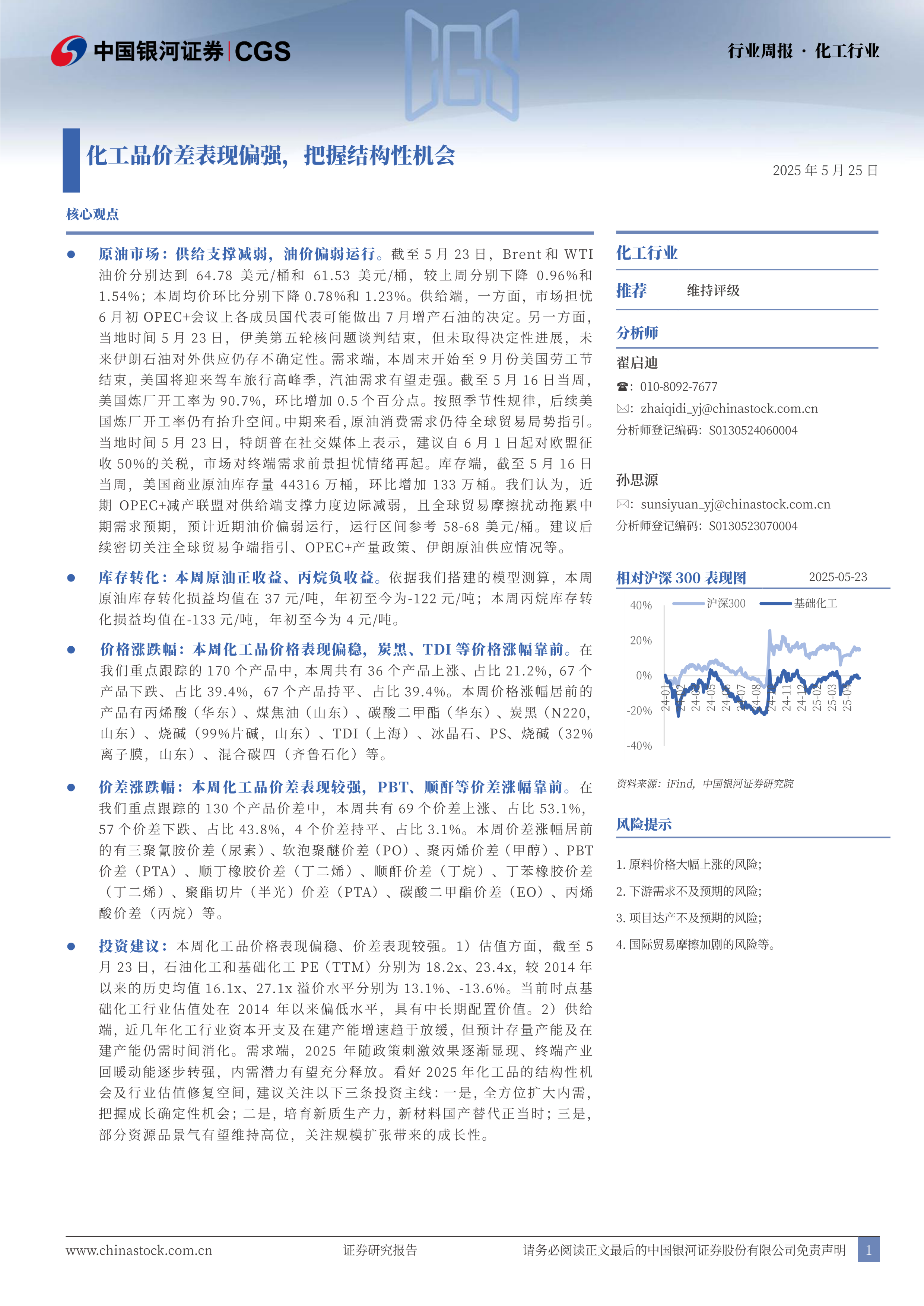 投资建议:本周化工品价格表现偏稳、价差表现较强。1)估值方面,截至5月23日,石油化工和基础化工PE(TTM)分别为18.2x、23.4x,较2014年以来的历史均值16.1x、27.1x溢价水平分别为13.1%、-13.6%。当前时点基础化工行业估值处在2014年以来偏低水平,具有中长期配置价值。2)供给端,近几年化工行业资本开支及在建产能增速趋于放缓,但预计存量产能及在建产能仍需时间消化。需求端,2025年随政策刺激效果逐渐显现、终端产业回暖动能逐步转强,内需潜力有望充分释放。看好2025年化工品的结构性机会及行业估值修复空间,建议关注以下三条投资主线:一是,全方位扩大内需,把握成长确定性机会;二是,培育新质生产力,新材料国产替代正当时;三是,部分资源品景气有望维持高位,关注规模扩张带来的成长性