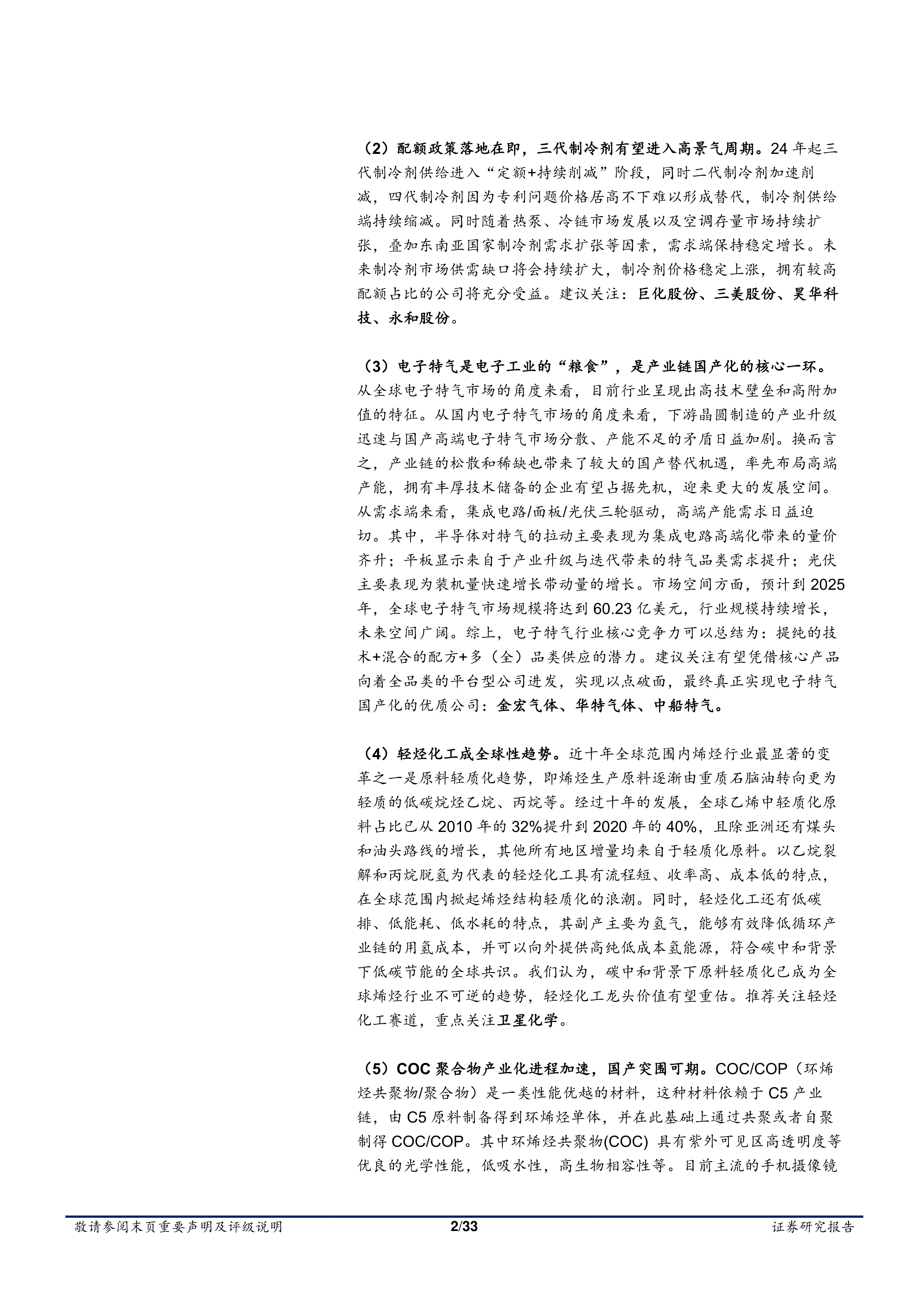 在双碳政策的推动下,未来化工行业在供给和需求面都将迎来巨大变化,行业正在进入发展的新阶段,由大规模制造转向高质量制造,新材料如雨后春笋,新要求、新趋势、新政策使得国内企业在新材料领域攻坚克难,已突破多个领域“卡脖子”技术,新材料渗透率与国产替代进程加速提升。伴随宏观经济企稳上升,政策扶持力度逐步提升,需求有望加速复苏带来新赛道的投资机会。推荐关注生物基尼龙、POE、光学膜、COC等新兴领域,重点关注凯赛生物、卫星化学、东材科技、阿科力、新宙邦等随需求复苏成长性加速释放的企业。