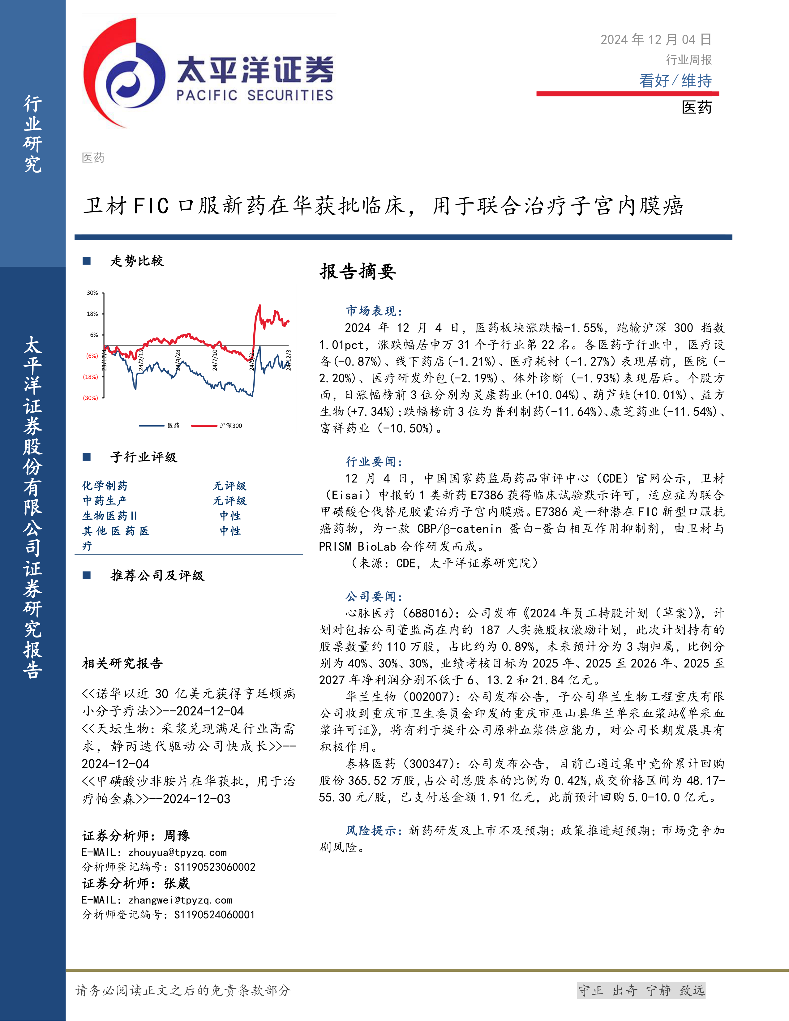 本报告对2024年12月4日医药行业整体表现进行了分析,指出医药板块整体表现弱于大盘,但个别公司表现突出。卫材FIC口服新药获批临床试验是行业内重要的进展,值得关注。部分公司发布的积极公告也显示出良好的发展前景。然而,投资者仍需关注新药研发及上市不及预期、政策推进超预期以及市场竞争加剧等风险。 报告信息主要基于公开资料,仅供参考,不构成投资建议。