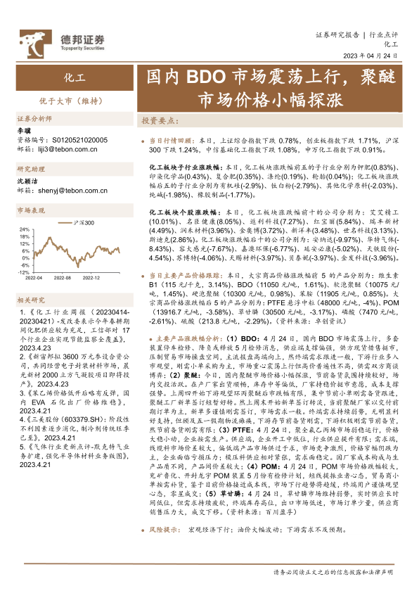 本报告基于4月24日的数据,对国内化工市场,特别是BDO和聚醚市场进行了分析。报告显示,当日化工市场表现分化,部分产品价格上涨,部分产品价格下跌。BDO和聚醚价格波动受供需关系和季节性因素影响较大。 报告还分析了化工板块整体市场表现及个股涨跌幅,并指出了潜在的市场风险。 投资者需密切关注宏观经济环境、油价波动以及下游需求变化,谨慎投资。 报告信息仅供参考,不构成投资建议。