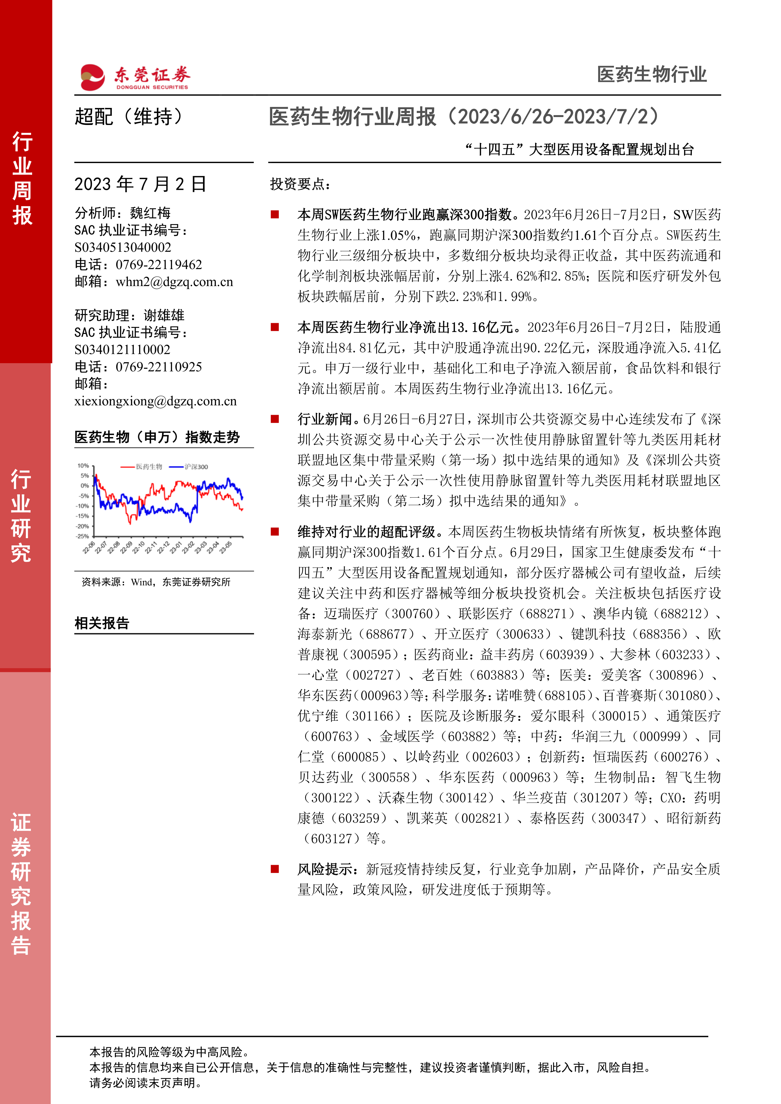 本报告的核心观点是:本周SW医药生物行业表现强劲,跑赢沪深300指数,多数细分板块录得正收益,但陆股通资金净流出。 “十四五”大型医用设备配置规划的出台为医疗器械行业带来利好,建议关注中药和医疗器械板块的投资机会。 报告风险等级为中高风险,投资者需谨慎决策。