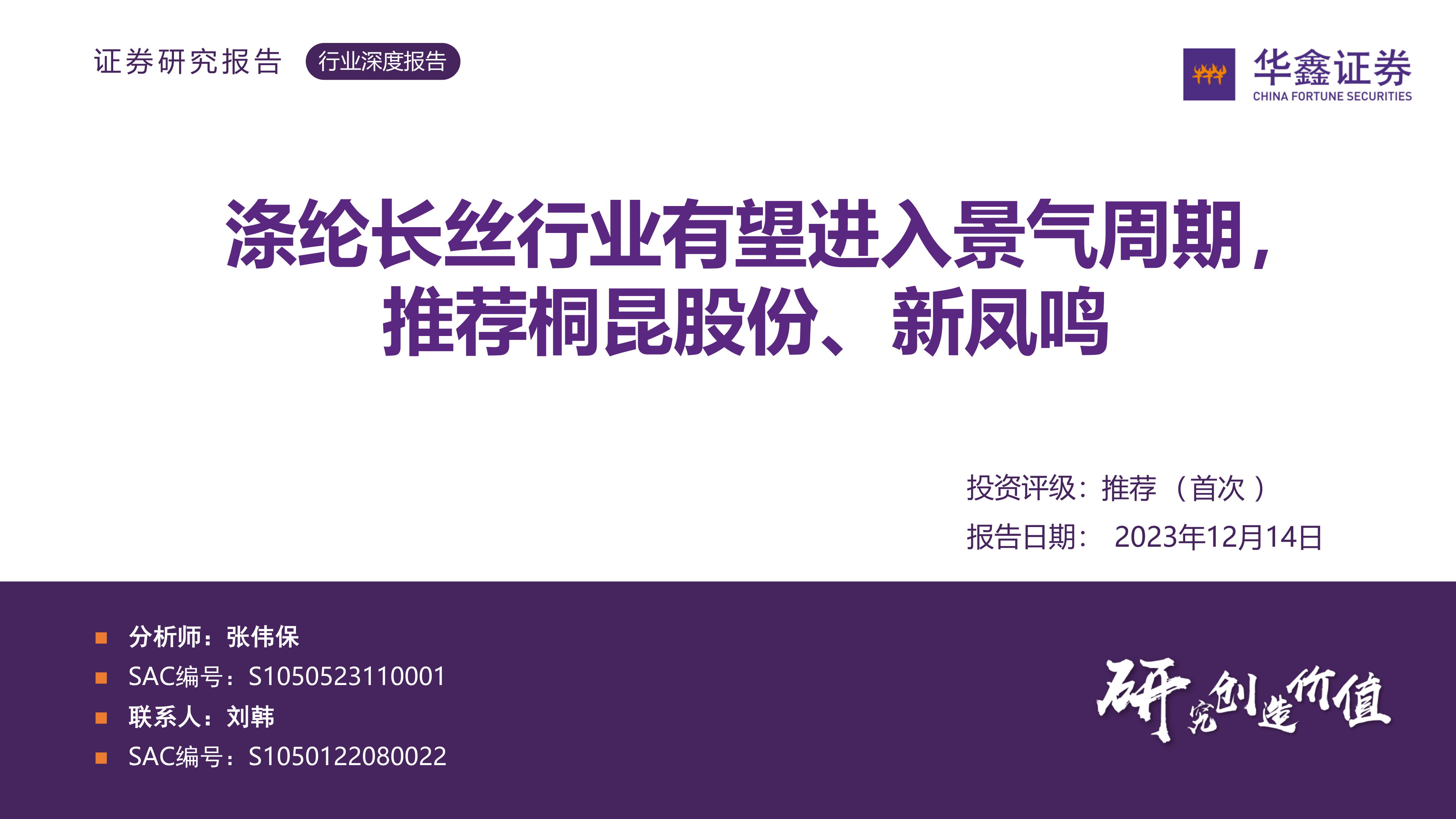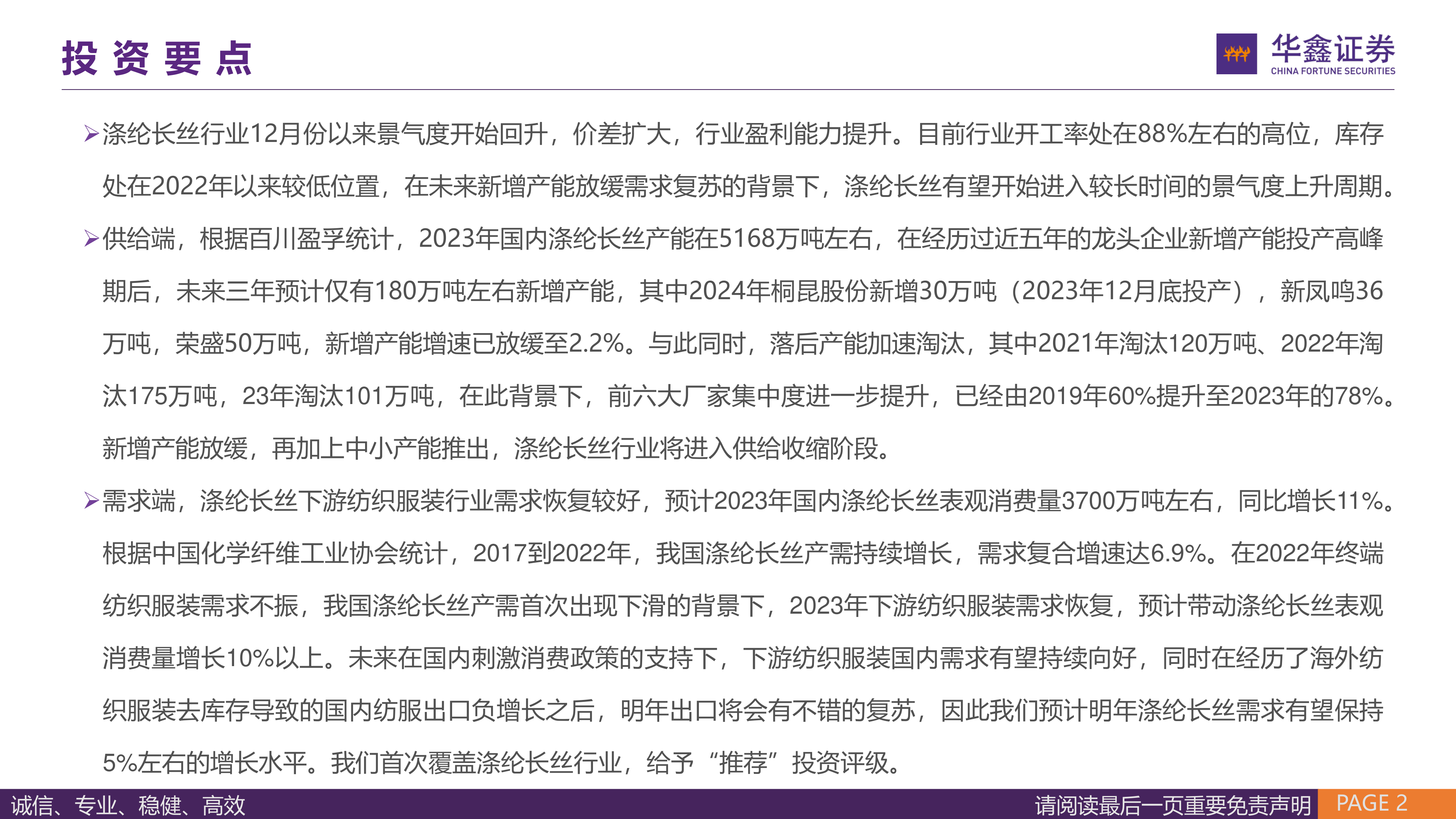 本报告分析了涤纶长丝行业的供需格局,认为行业有望进入景气周期。供给端增速放缓,落后产能加速淘汰,行业集中度提升;需求端持续改善,下游纺织服装行业复苏,涤纶长丝价格优势显著。报告推荐投资桐昆股份和新凤鸣两家龙头企业,并对其未来业绩进行了详细预测,认为两家公司都将受益于行业景气度提升,并拥有巨大的业绩弹性。 报告中也指出了经济下行、产品价格波动、项目建设不及预期等风险因素,投资者需谨慎决策。