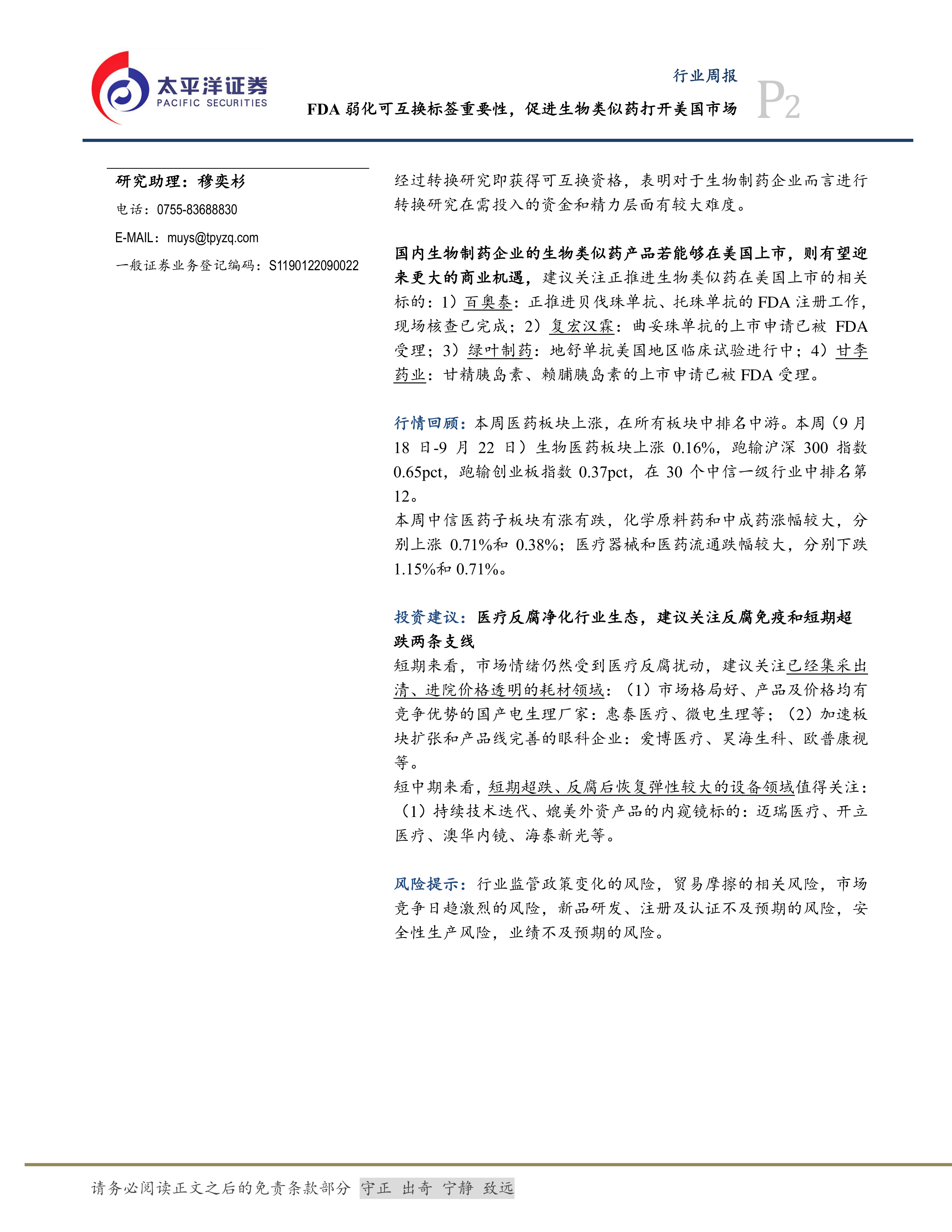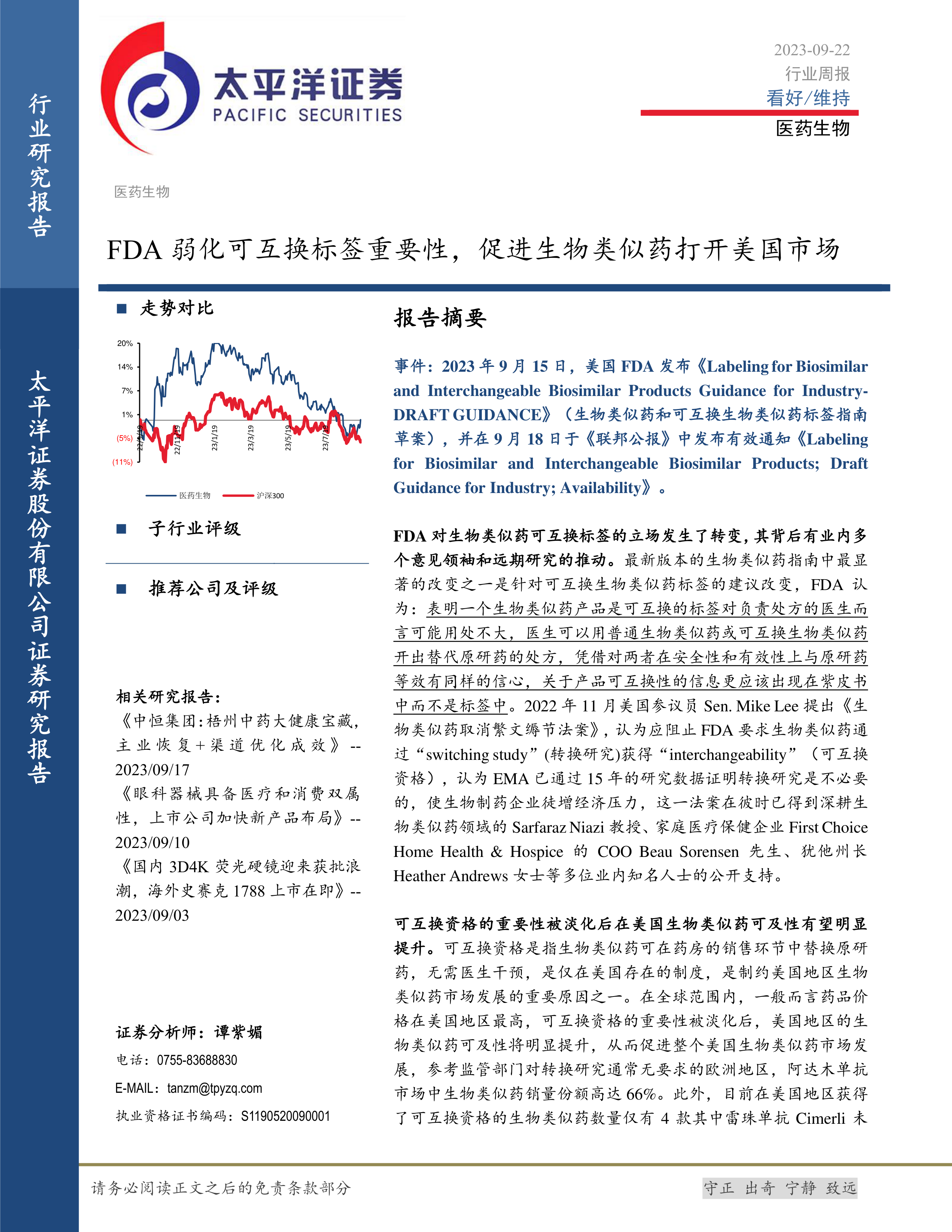 医药生物行业周报:FDA弱化可互换标签重要性,促进生物类似药打开美国市场