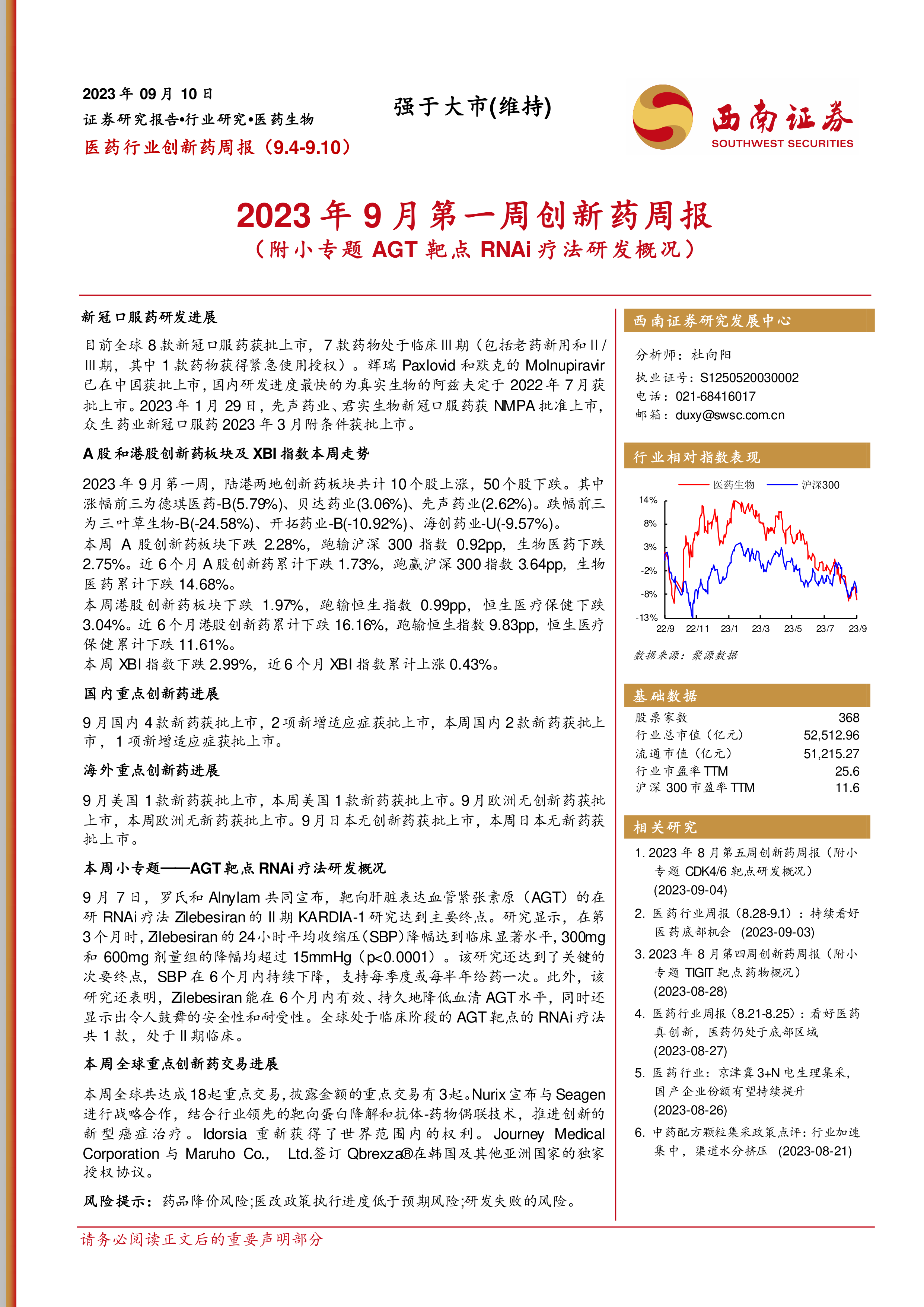 2023年9月第一周创新药周报(附小专题AGT靶点RNAi疗法研发概况)