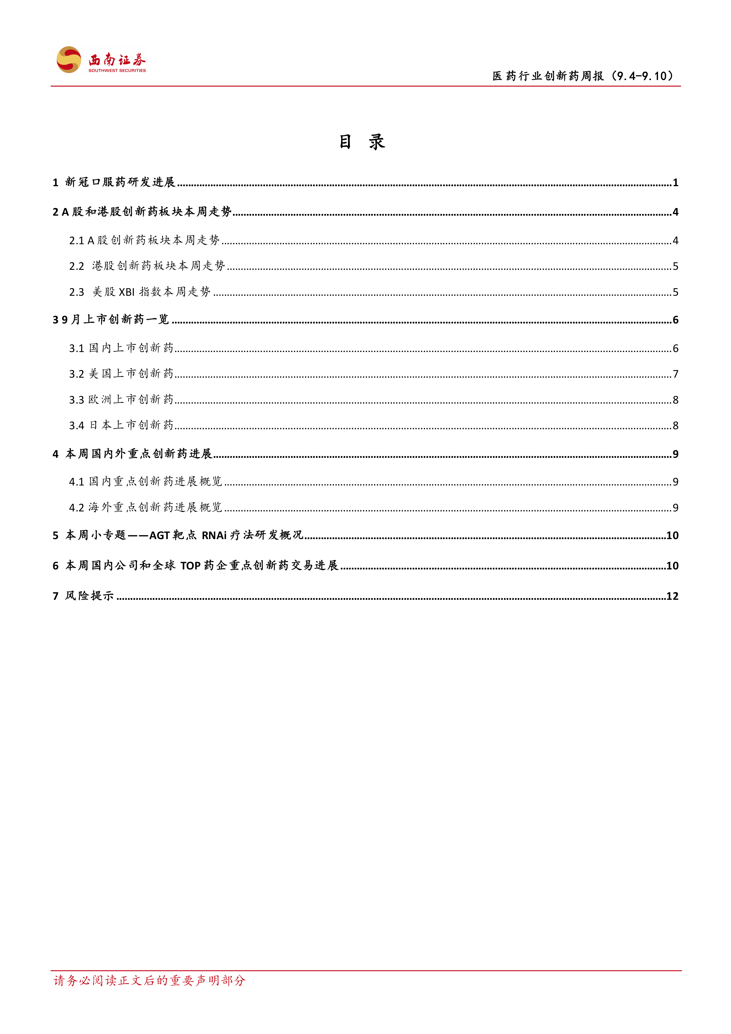 本报告对2023年9月第一周医药行业创新药市场进行了全面分析,涵盖了新冠口服药研发进展、A股和港股创新药板块走势、9月上市创新药情况、本周国内外重点创新药进展、AGT靶点RNAi疗法研发概况以及本周重点创新药交易等多个方面。 数据显示,本周创新药市场表现整体疲软,但国内外新药研发持续推进,市场竞争依然激烈。 投资者需关注药品降价风险、医改政策以及研发风险等因素,谨慎投资。