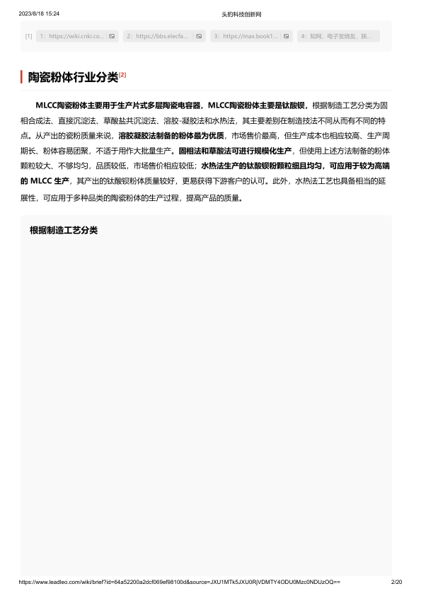陶瓷粉体是指制备陶瓷时所有原料经充分混合均匀后焙烧磨制后的粉末状物质,具有高硬度、耐磨性、化学稳定性等特点。本报告主要关注MLCC陶瓷粉体,其主要成分为钛酸钡。根据制造工艺的不同,MLCC陶瓷粉体可分为固相合成法、直接沉淀法、草酸盐共沉淀法、溶胶-凝胶法和水热法等几类,不同方法生产的粉体在质量、成本和生产规模上存在差异。其中,溶胶-凝胶法制备的粉体质量最高,但成本也最高,而固相法和草酸法更适合大规模生产,水热法则兼顾了质量和规模化生产的优势。