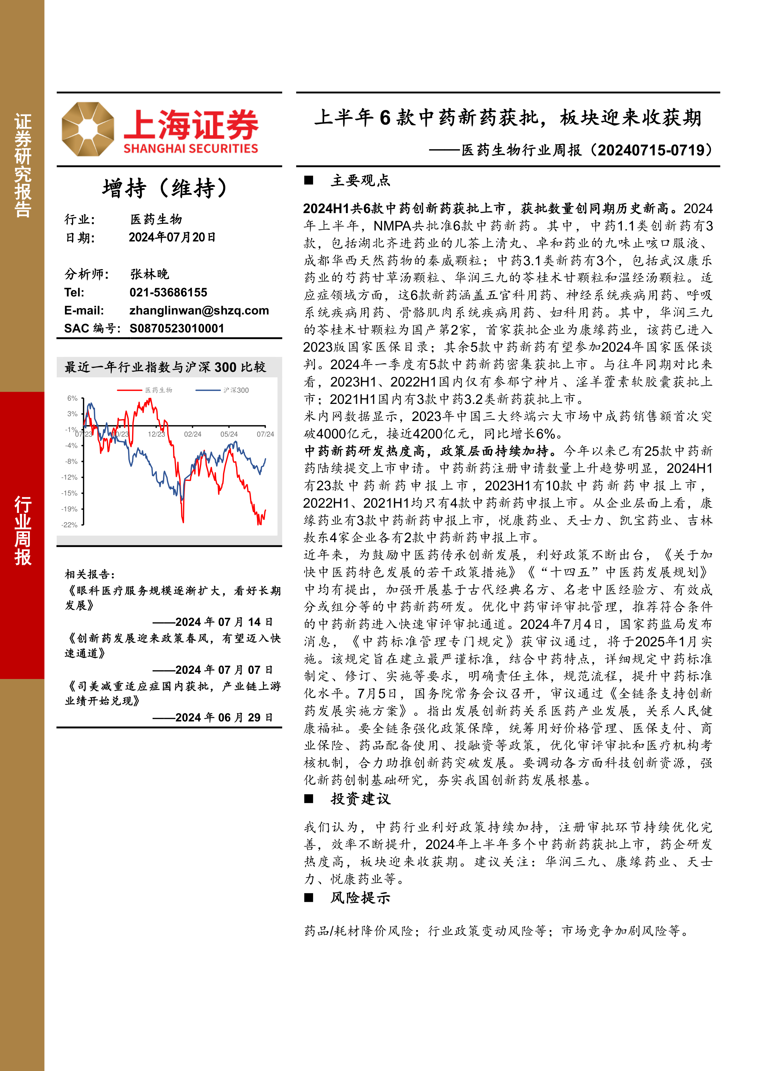 我们认为,中药行业利好政策持续加持,注册审批环节持续优化完善,效率不断提升,2024年上半年多个中药新药获批上市,药企研发热度高,板块迎来收获期。建议关注:华润三九、康缘药业、天士力、悦康药业等。