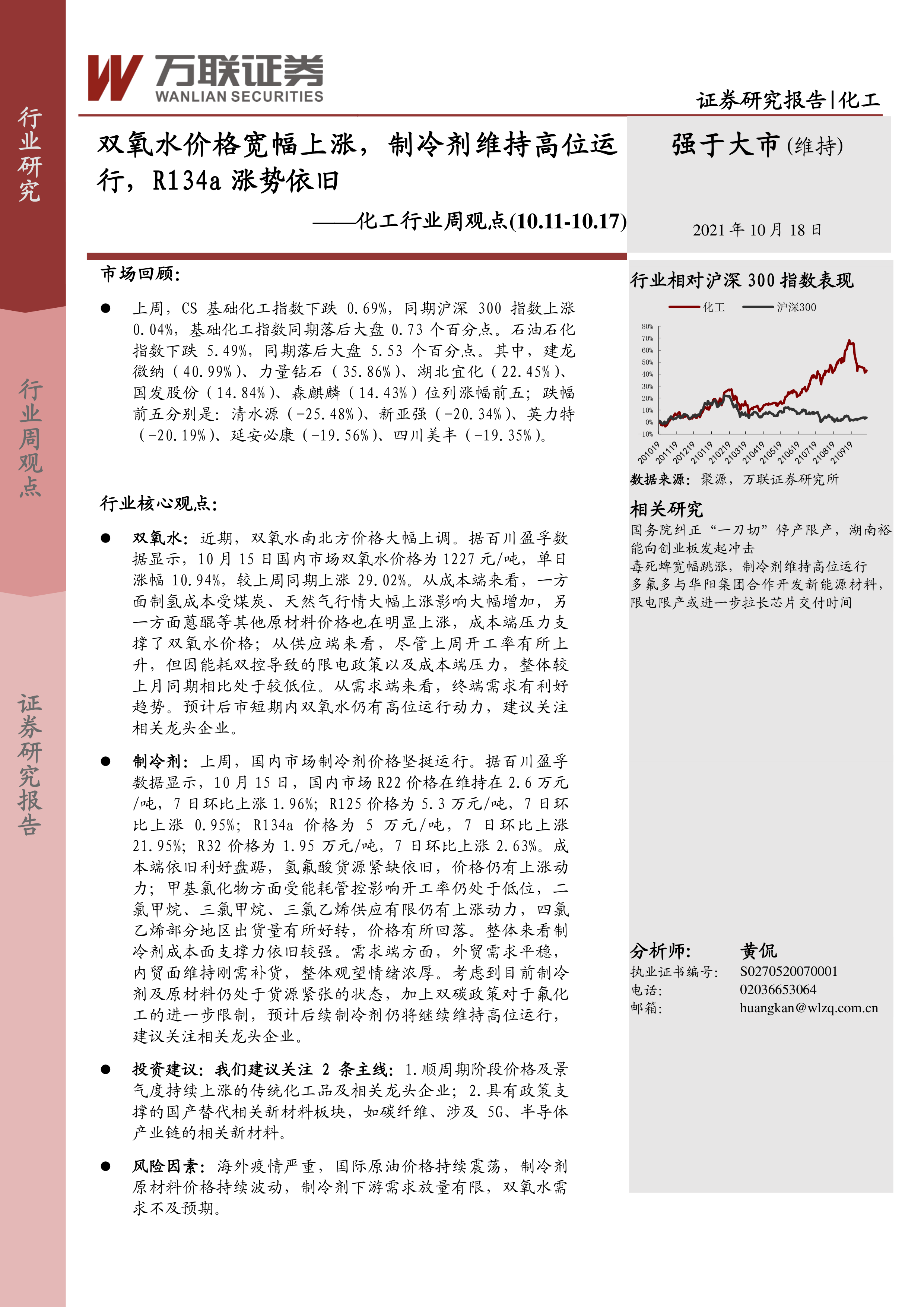 化工行业周观点:双氧水价格宽幅上涨,制冷剂维持高位运行,R134a涨势依旧