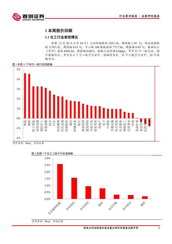 本周(2月20日-2月24日),上证综指上涨1.34%,深证成指上涨0.61%,中小板100指数上涨0.45%。基础化工(申万)上涨0.66%,跑输上证综指0.68个百分点。申万31个一级行业中,28个上涨;申万化工7个二级子行业均上涨;33个三级子行业中,24个上涨。本周化工行业386家上市公司中,222家上涨。涨幅居前的个股有诺普信、宏达股份、湖南海利等;跌幅居前的个股有博菲电气、怡达股份、金奥博等。