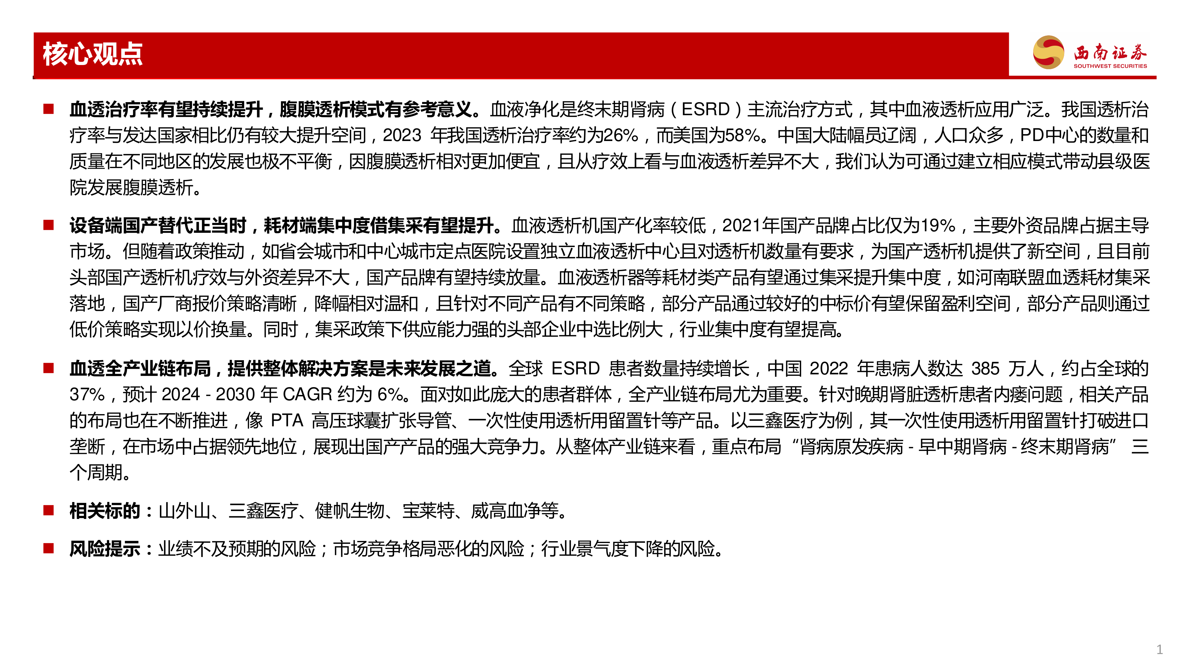 本报告的核心观点是:中国肾科市场,尤其血液透析领域,尽管面临国产替代和行业集中度提升的挑战与机遇,但整体呈现稳定增长态势。治疗率提升空间巨大,腹膜透析模式值得借鉴;国产设备和耗材替代加速,集采政策推动行业集中度提升;全产业链布局是未来发展趋势。