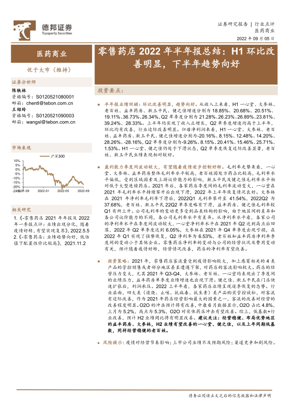 投资策略:2021年,零售药店客流量受到疫情影响较大,加上感冒相关的4类产品的管控销售或者部分地区甚至遭遇下架,对药店的客流影响较大。药店的经营压力变大,尤其2021年Q3-Q4,大参林、老百姓、一心堂均表现出了季度间的业绩压力,益丰药房单季度业绩增速也出现下滑。健之佳、漱玉平民在门店快速扩张后,利润承压。2022上半年看,各家药店业绩呈现逐季恢复的态势。行业层面,四大类(退烧、止咳、抗病毒、抗生素)类产品购买管控放松,对客流有边际改善,作为2021年药店经营影响最大的因素之一,客流的改善对经营的改善程度明显。O2O的冲击预计将有改善,中康6月数据显示,O2O占比4.8%,上月为5.2%,高点为5.3%,O2O对实体药店冲击有望改善。综上,低基数+行业改善,预计H2业绩同比将有明显改善。建议关注:经营稳健、布局优势地区的益丰药房、大参林,H2业绩有望改善的一心堂、健之佳,以及上年同期低基数,同样经营稳健的老百姓。