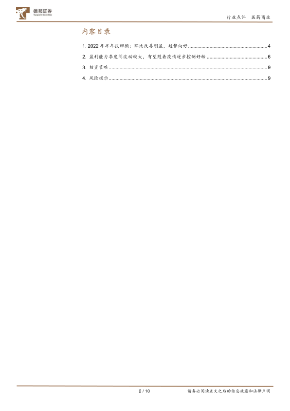 本报告通过对2022年上半年中国零售药店行业半年报数据的分析,得出结论:行业整体业绩呈现环比改善的趋势,下半年有望进一步向好。 虽然盈利能力在季度间波动较大,但随着疫情防控政策的优化和市场环境的改善,行业整体正逐步恢复。 报告建议投资者关注具备长期竞争优势和增长潜力的药店企业,同时需谨慎评估潜在的市场风险。 报告中提供的详细数据和图表,为投资者提供了深入了解行业现状和未来发展趋势的参考依据。