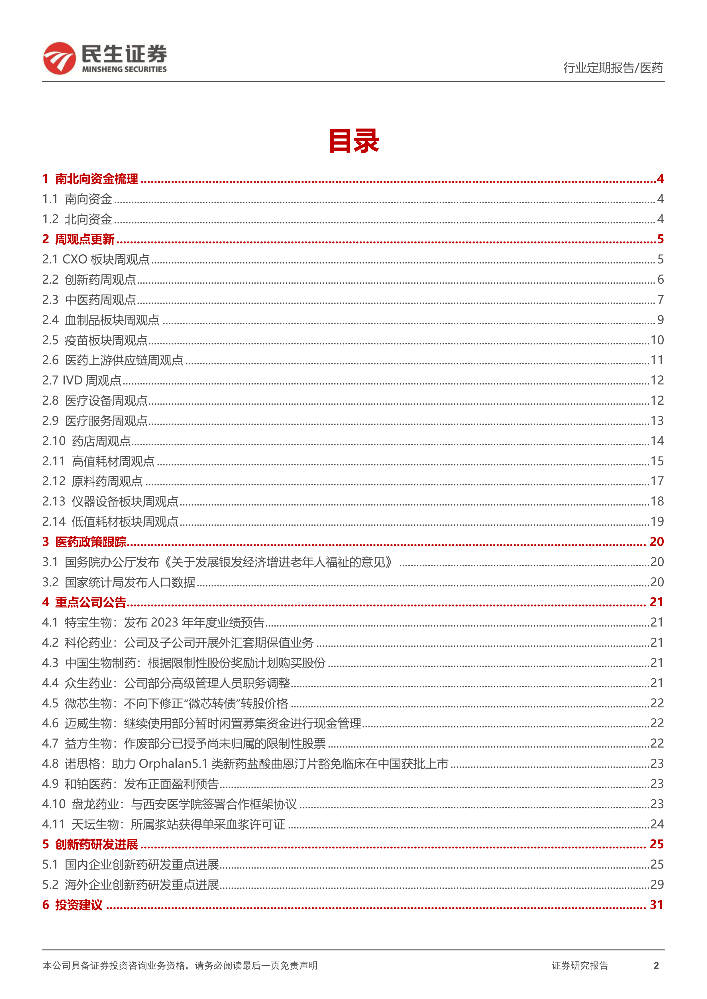 1) CXO: 关注海外需求持续边际回暖。 看好仿制药 CRO 细分板块业绩持续释放,订单持续高景气,分成类业务进入拐点向上周期。 2)创新药: 1 月 15 日,国务院办公厅发布《关于发展银发经济增进老年人福祉的意见》; 1 月 17 日国家统计局发布人口数据,人口总量减少,城镇化比例提升,建议关注“银发经济”和老龄化相关方向,如阿尔兹海默症药物及诊断方向、老花眼方向等。 3)中医药: 流感检测阳性率仍较高,关注呼吸道疾病终端需求,长期建议关注板块业绩稳健增长和高分红属性。 3)中医药: 流感检测阳性率仍较高,关注呼吸道疾病终端需求,长期建议关注板块业绩稳健增长和高分红属性。 4)疫苗与血制品:中长期来看,疫苗板块关注二类苗大单品,如带状疱疹疫苗、 HPV 疫苗等产品需求的提升。血制品行业资源属性强,行业国企化进程不断推进,关注行业供给与需求双重景气度提升。 5)医药上游供应链: 创新药行情回暖,投融资底部回升,国内竞争环境开始转好,叠加海外市场开拓,有望带动 2024 年生科链板块业绩+估值修复,重点关注制药工业端大订单落地以及出海节奏。 6)医疗设备与IVD: 设备方面关注高端设备出海,如联影医疗和华大智造; IVD 方面关注国内的集采政策落地后具体情况推进和在海外市场的仪器铺货及单产情况,如迈瑞医疗、新产业和亚辉龙等。 7)医疗服务: 建议重点关注与公立医院形成差异化竞争,或形成优势互补的医疗服务细分板块。 8)线下药店: 门诊统筹政策陆续落地实行,随着门诊统筹管理药房渗透率提升带来人流量提升, 24Q1 有望优于预期,建议重点关注。 9)高值耗材: 关注流感潮汐下呼吸道 POCT 快检产品的系统性投资机会及年报一季报兑现机会,短期推荐基本面较强的电生理、神经介入、外周和大支架领域,其次关注运动医学国家集采及关节集采续约谈判中有望出现积极变化的骨科领域国产龙头公司,明年关注集采影响出清后有望出现业绩拐点的脊柱领域。 10)原料药: 关注具有多层次竞争优势的行业龙头及产业链延伸方向,以及产品价格有望率先反转的肝素及沙坦领域重点公司。 11)仪器设备: 关注临床检测设备增量市场机会,肝脏弹性检测设备检测有望受益于 NASH 新药获批和 glp-1 药物适应症拓展,科学仪器下游应用不断拓展深化,关注产业东风下国产龙头的业绩兑现机会,有望享受国产替代和检测项目拓展双重利好加入放量。 12)低值耗材: 关注 GLP-1 相关上游辅包材需求提升和潜在国产厂商切入供应链的机遇;关注丁腈手套行业下游需求复苏带来的投资机会。