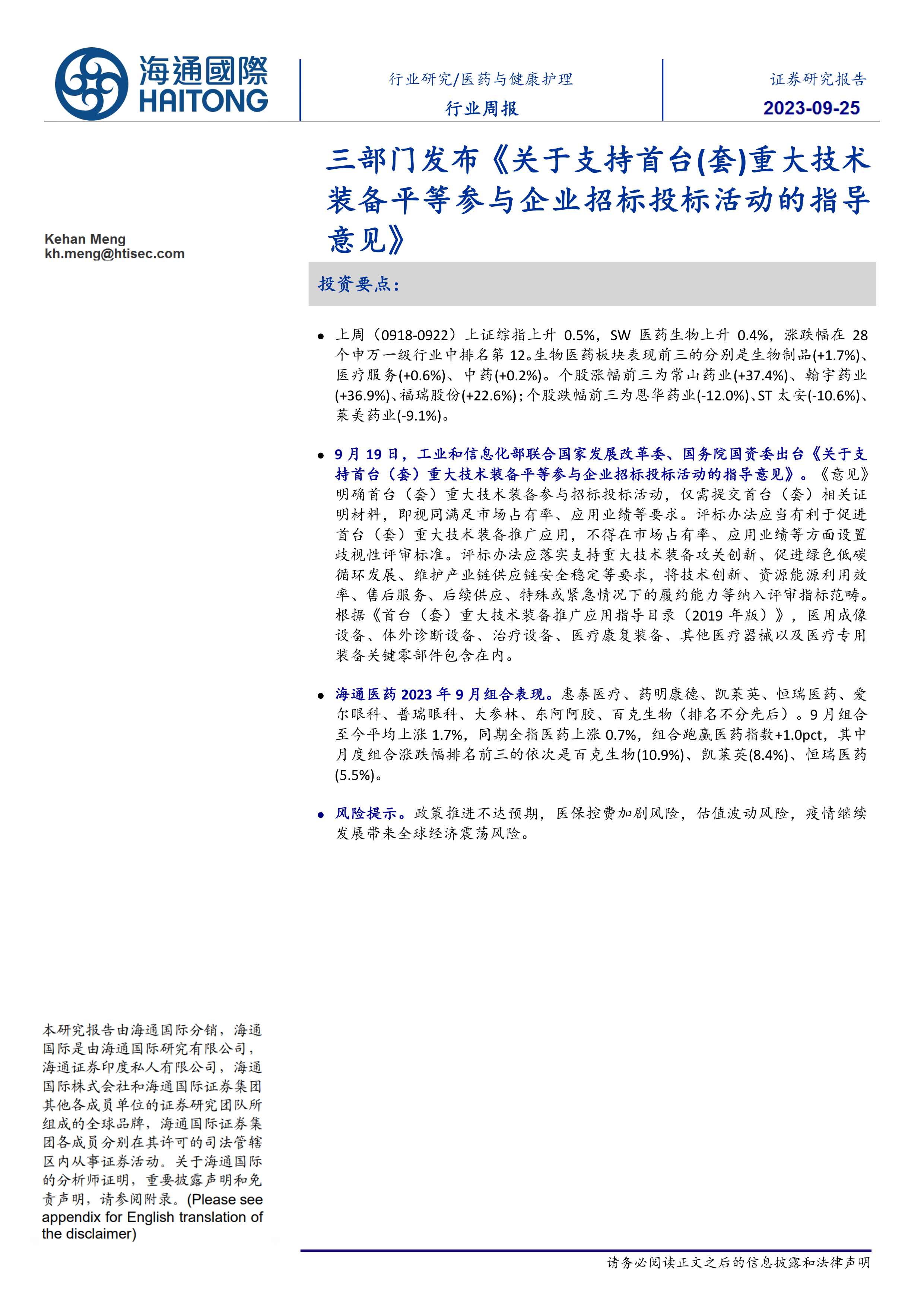本报告对上周医药生物板块行情、国家政策对医疗器械行业的影响以及海通医药9月组合表现进行了分析。总体而言,医药生物板块表现稳健,国家政策利好医疗器械行业发展,部分个股表现突出。然而,投资者仍需密切关注政策风险、医保控费风险以及全球经济波动风险,谨慎投资。 报告数据主要基于Wind和海通国际的数据,时间截至2023年9月22日。 需注意,报告中提及的个股涨跌幅仅供参考,不构成投资建议。