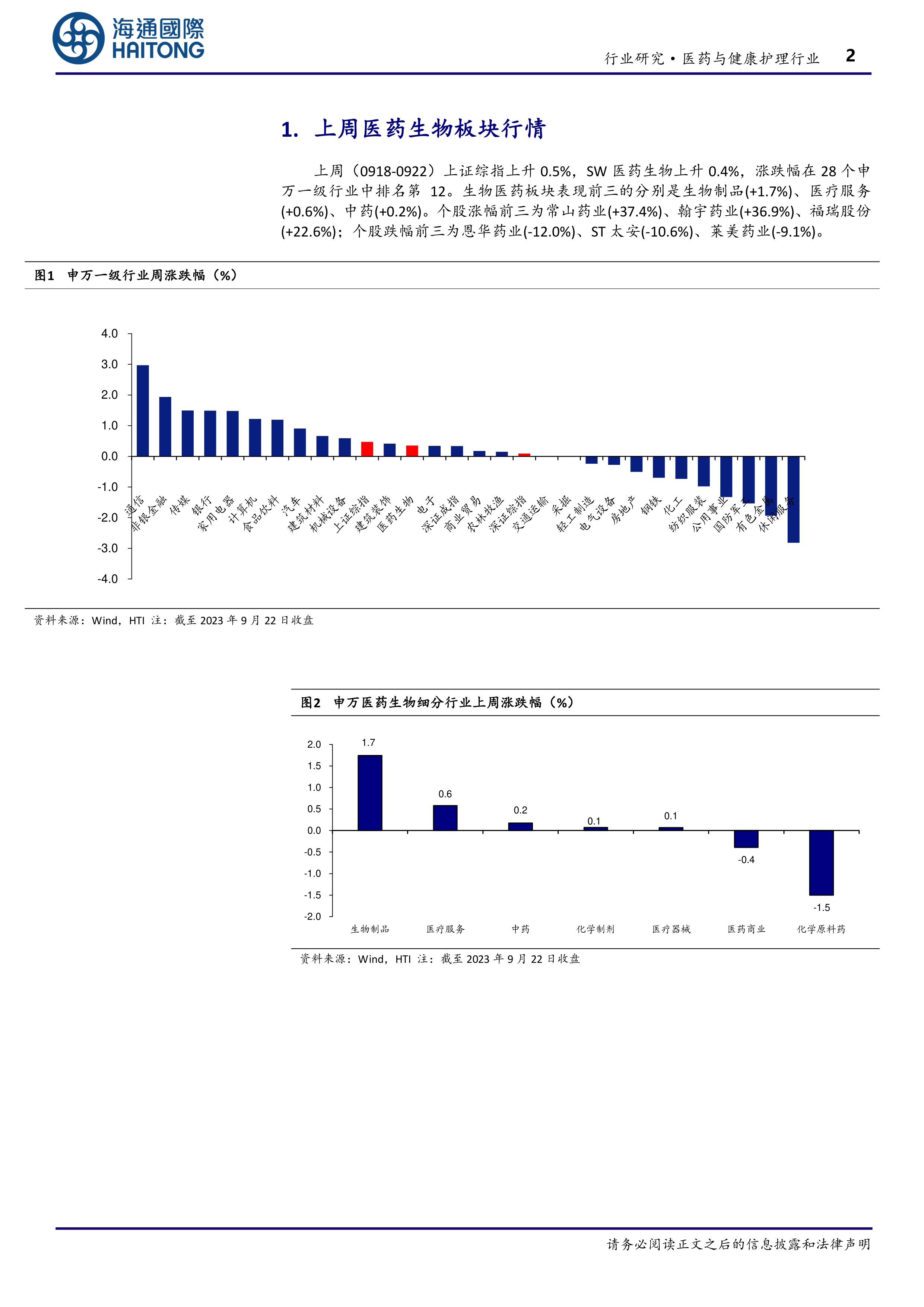 上周(0918-0922)上证综指上升0.5%,SW医药生物上升0.4%,涨跌幅在28个申万一级行业中排名第12。生物医药板块表现前三的分别是生物制品(+1.7%)、医疗服务(+0.6%)、中药(+0.2%)。个股涨幅前三为常山药业(+37.4%)、翰宇药业(+36.9%)、福瑞股份(+22.6%);个股跌幅前三为恩华药业(-12.0%)、ST太安(-10.6%)、莱美药业(-9.1%)。