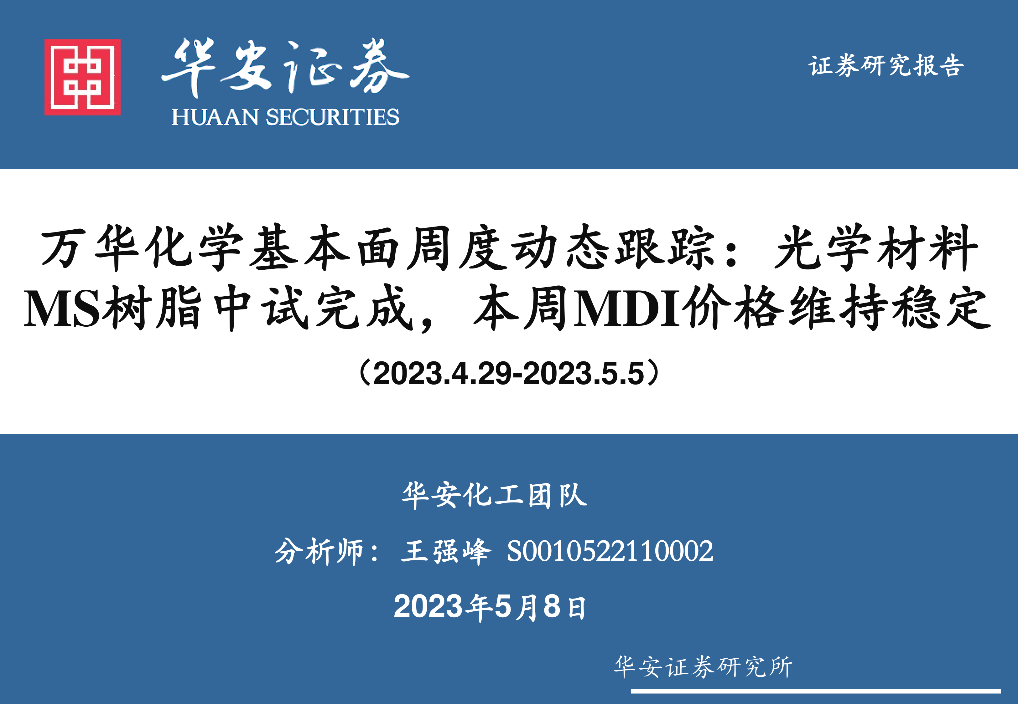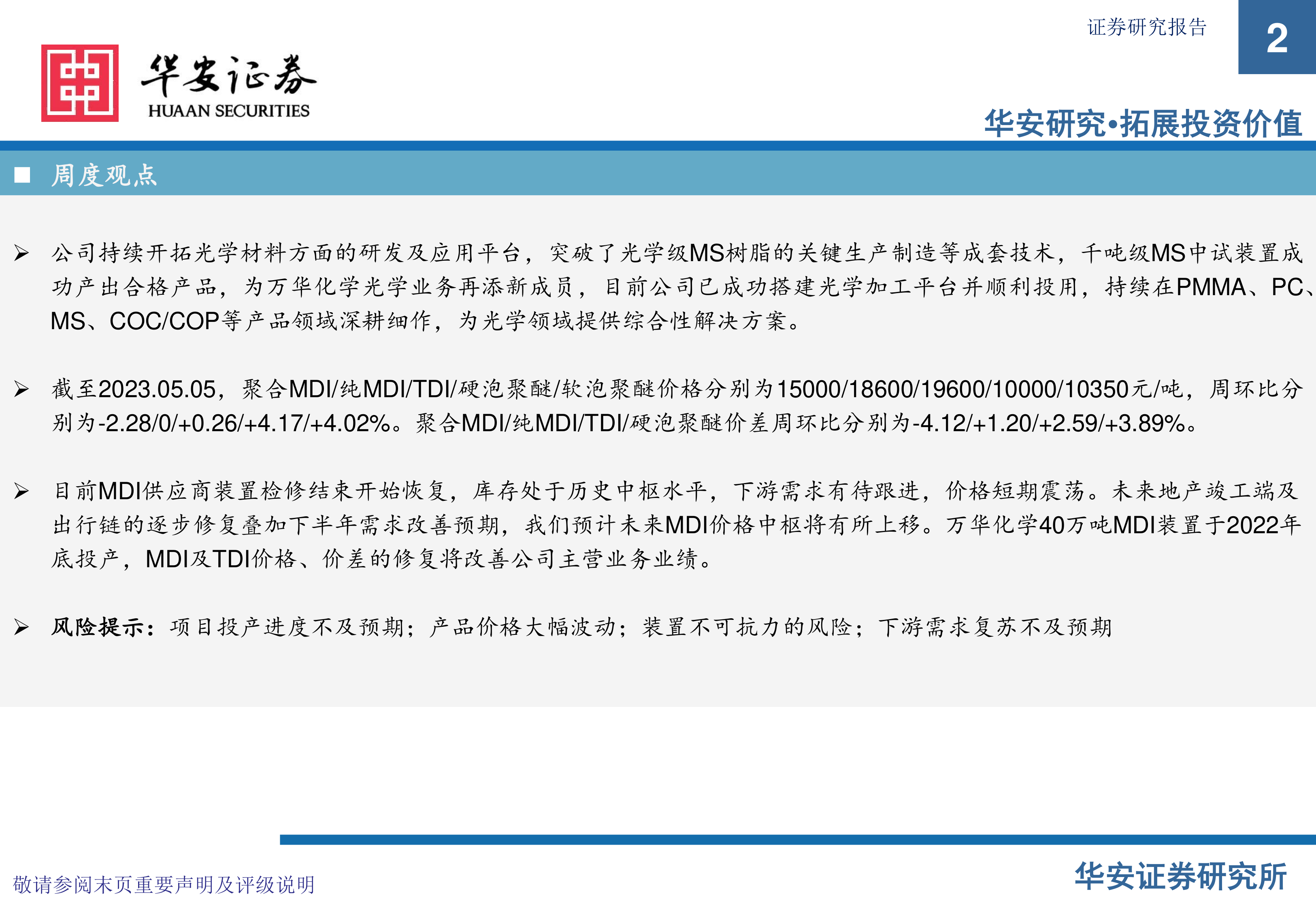 本报告的核心观点是:万华化学在光学材料领域取得突破性进展,千吨级MS树脂中试装置成功产出合格产品,为其光学业务拓展奠定了坚实基础;同时,MDI市场短期内价格震荡,但长期来看,随着下游需求复苏,价格中枢有望上移,这将利好万华化学的主营业务业绩。