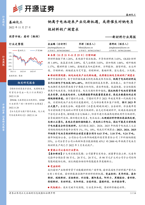 新材料周观察:钠电池迎来产业化新机遇,或将催生钠电负极材料广阔需求据中科海钠官网,由于钠价格低廉且钠电池集流体为铝箔, 钠离子电池的材料成本约比锂电子电池低 30%-40%,拥有较强的成本优势。在性能上,由于钠离子电池拥有更高的界面离子扩散能力和内阻,其倍率性能、低温性能、安全性能较锂离子电池更佳,但能量密度、电压及循环寿命偏低。 因此钠离子电池有望凭借成本优势,在低速电动车、大规模储能等低能量密度要求、高成本敏感性的应用领域持续渗透。据宁德时代公告,宁德时代早于 2021 年就发布第一代钠离子电池,目前钠电池产业化项目进展顺利,已与部分乘用车客户协商,预计 2023 年正式量产。金属化合物、碳基材料(石墨类/硬碳/软碳)、合金材料、非金属单质为目前钠离子电池的 4 种常见的负极材料。 在无定形碳材料中,软碳在高温处理下会充分石墨化,储钠能力会大幅减小,但若不进行高温热处理就用作负极材料,会导致储钠可逆性、循环稳定性变差、电压延后; 而硬碳材料即便经高温热处理,也难以石墨化,表现出更强的储钠能力、更低的工作电位,因此可能是目前钠离子电池最适合的负极材料。我们假设 2023、2024、2025 年钠离子电池在三大应用领域领域的渗透率分别为 1%、 5%、 10%,则我们可测算出: 2023、 2024、 2025年钠离子电池负极材料的全球需求量分别为 0.43 万吨、3.10 万吨、9.24 万吨。据华阳股份公告,公司孙公司山西华钠碳能科技有限责任公司(中科海钠持股55%,公司全资子公司山西新阳清洁能源持股 45%)的 2000 吨/年钠离子电池负极材料生产线已于 2022 年 3 月末试投产。