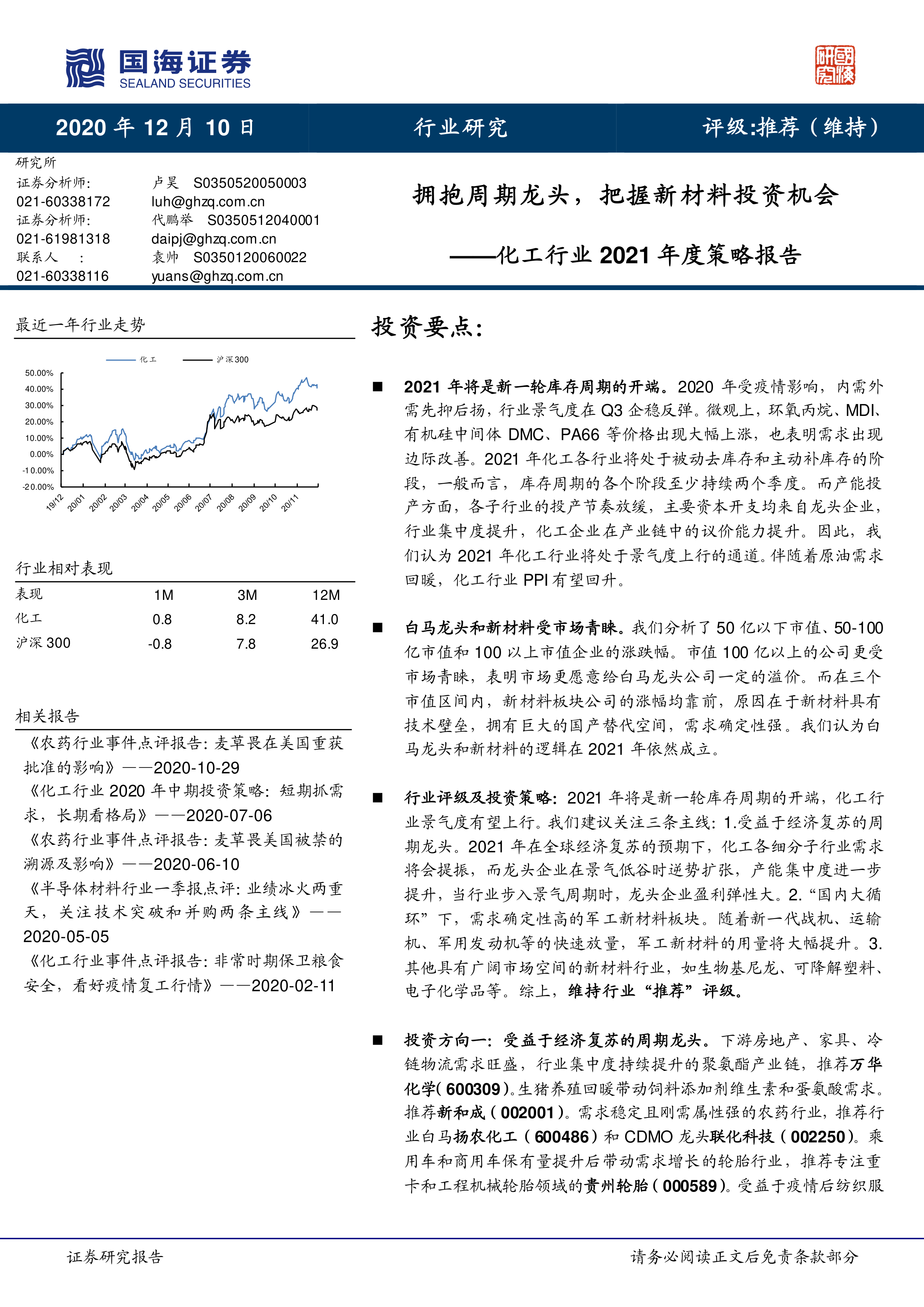 本报告从2020年化工行业回顾和2021年行业展望两个方面展开分析,并提出了具体的投资策略和方向。