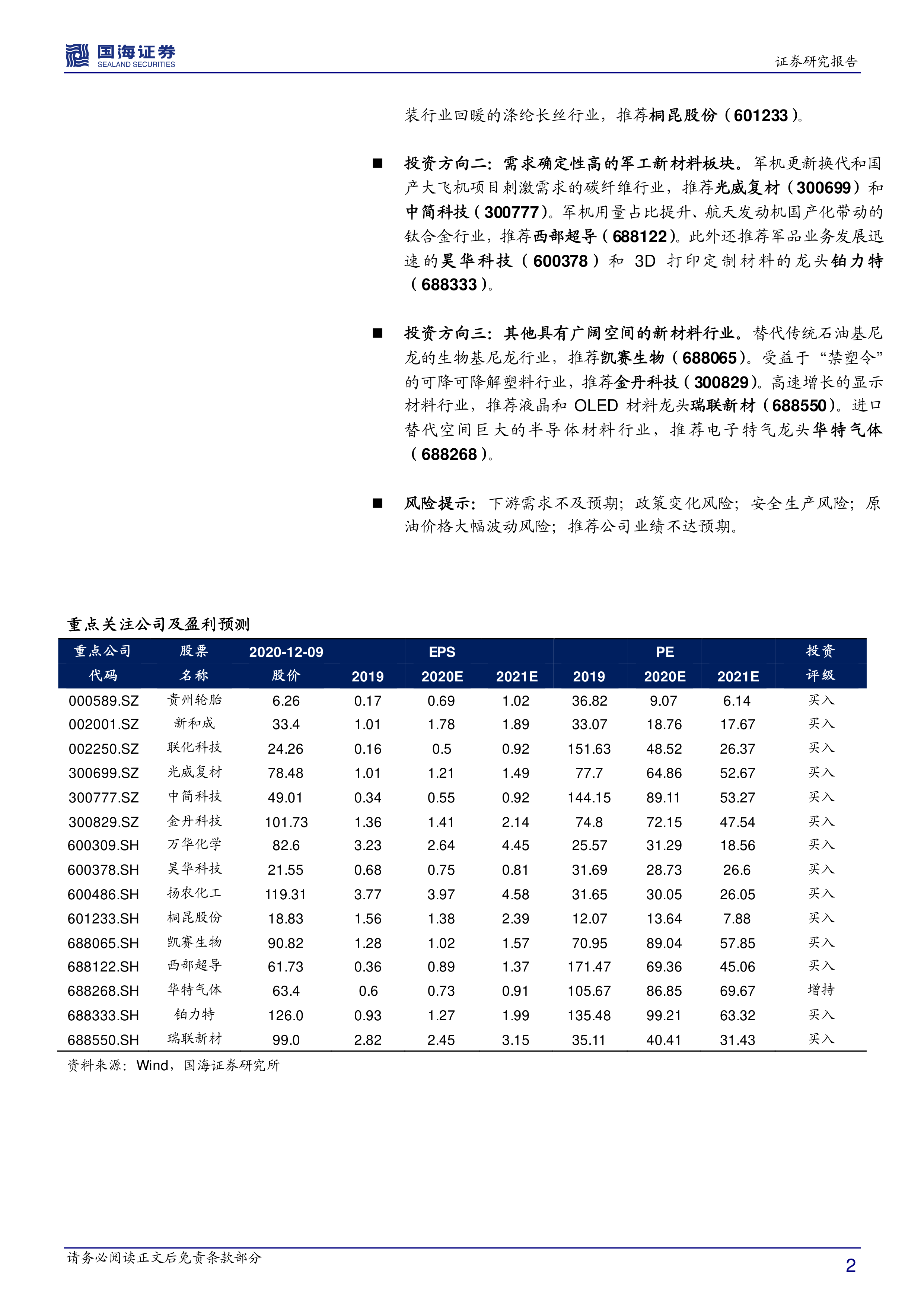 本报告的核心观点是:2021年化工行业景气度有望上行,进入新一轮库存周期,建议关注三条投资主线:受益于经济复苏的周期龙头企业;“国内大循环”下需求确定性高的军工新材料板块;以及其他具有广阔市场空间的高增长新材料行业。