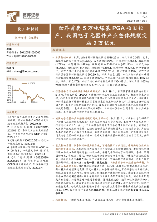 化工新材料行业周报:世界首套5万吨煤基PGA项目投产,我国电子元器件产业整体规模突破2万亿元