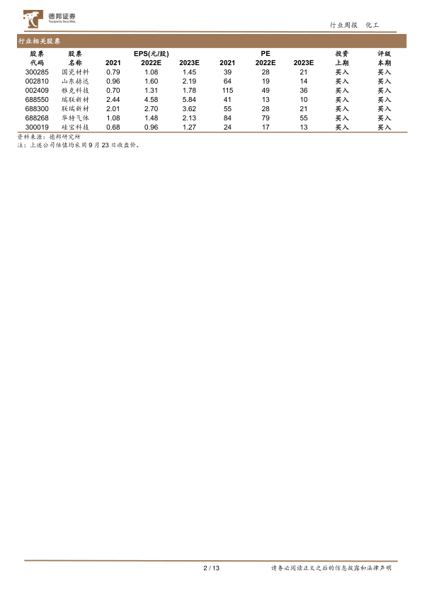 重点标的推荐:半导体材料国产化加速,下游晶圆厂扩产迅猛,看好头部企业产业红利优势最大化。光刻胶板块为我国自主可控之路上关键核心环节,看好彤程新材在进口替代方面的高速进展。特气方面,华特气体深耕电子特气领域十余年,不断创新研发,实现进口替代,西南基地叠加空分设备双重布局,一体化产业链版图初显,建议重点关注华特气体。电子化学品方面,下游晶圆厂逐步落成,芯片产能有望持续释放,建议关注:安集科技、鼎龙股份。下游需求推动产业升级和革新,行业迈入高速发展期。国内持续推进制造升级,高标准、高性能材料需求将逐步释放,新材料产业有望快速发展。国瓷材料三大业务保持高增速,有条不紊打造齿科巨头,新能源业务爆发式增长,横向拓展、纵向延伸打造新材料巨擘,建议重点关注新材料平台型公司国瓷材料。高分子材料的性能提升离不开高分子助剂,国内抗老化剂龙头利安隆,珠海新基地产能逐步释放,凭借康泰股份,进军千亿润滑油添加剂,打造第二增长点,建议重点关注国内抗老化剂龙头利安隆。碳中和背景下,绿电行业蓬勃发展,光伏风电装机量逐渐攀升,建议关注上游原材料金属硅龙头企业合盛硅业、EVA粒子技术行业领先的联泓新科、拥有三氯氢硅产能的新安股份以及三孚股份。