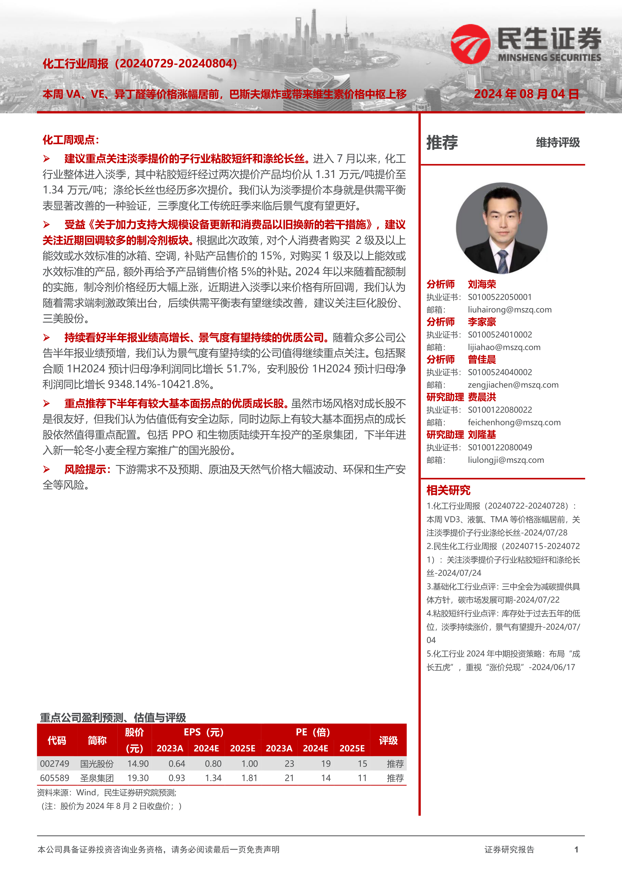 本报告对2024年7月29日至2024年8月4日期间的化工行业进行了全面分析。报告指出,化工行业整体进入淡季,但部分子行业如粘胶短纤、涤纶长丝表现强劲,部分产品价格上涨,显示供需关系改善。巴斯夫爆炸事件可能导致维生素价格中枢上移。同时,国家政策利好也刺激了部分板块,例如制冷剂板块。报告建议重点关注淡季提价的子行业和受益于政策的板块,并推荐了部分业绩高增长和基本面拐点公司。 报告中大量图表数据清晰地展现了化工行业各子行业及产品的价格波动、供需变化和市场趋势,为投资者提供了重要的参考信息。 然而,报告也指出了下游需求不及预期、原油及天然气价格大幅波动、环保和生产安全等风险,投资者需谨慎投资。