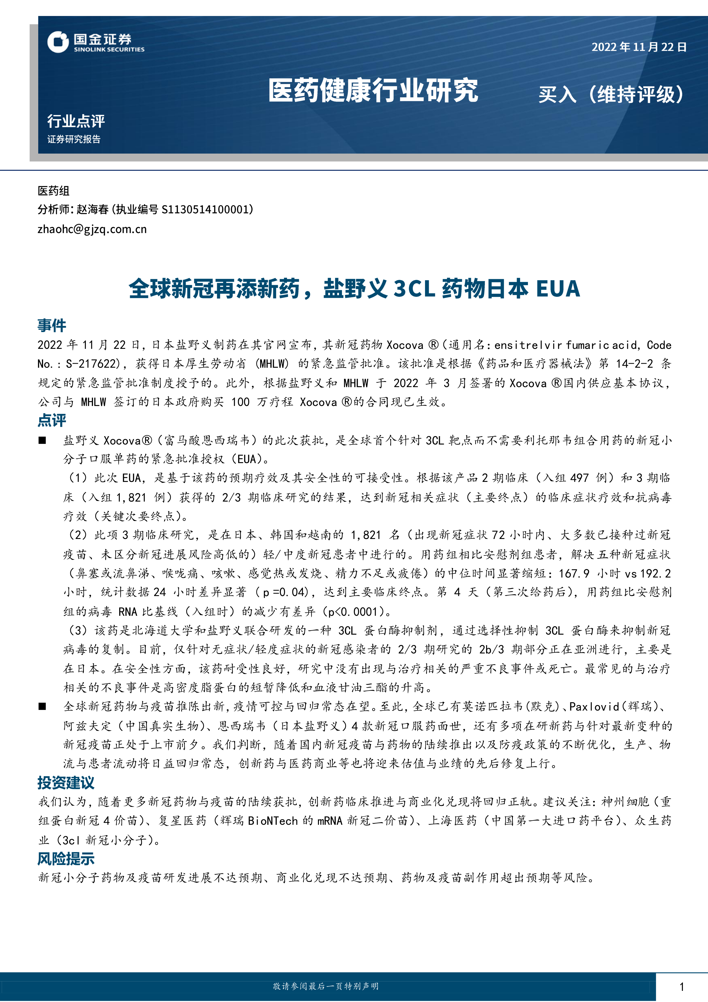 医药健康行业研究:全球新冠再添新药,盐野义3CL药物日本EUA
