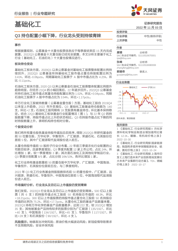 本报告基于2022年Q3公募基金十大重仓股信息,对基础化工和石油化工行业进行了市场分析。核心观点如下: